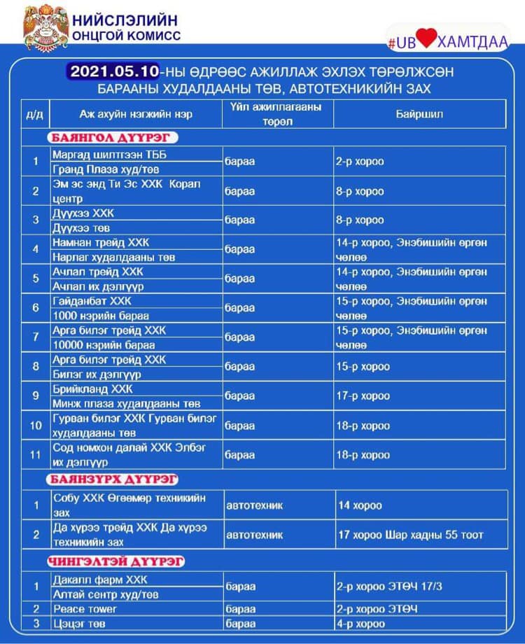 Халдвар хамгааллын дэглэмийг нэг түвшин бууруулж, өндөржүүлсэн бэлэн байдлын зэрэгт шилжсэнтэй холбогдуулан зах худалдааны төвүүдийг үе шаттайгаар нээж эхэлсэн. Үүнтэй холбоотойгоор өнөөдөр буюу тавдугаар сарын 10-ны өдрөөс эхлэн үйл ажиллагаагаа явуулж эхлэх худалдлаа, үйлчилгээний байгууллагын мэдээллийг хүргэе.