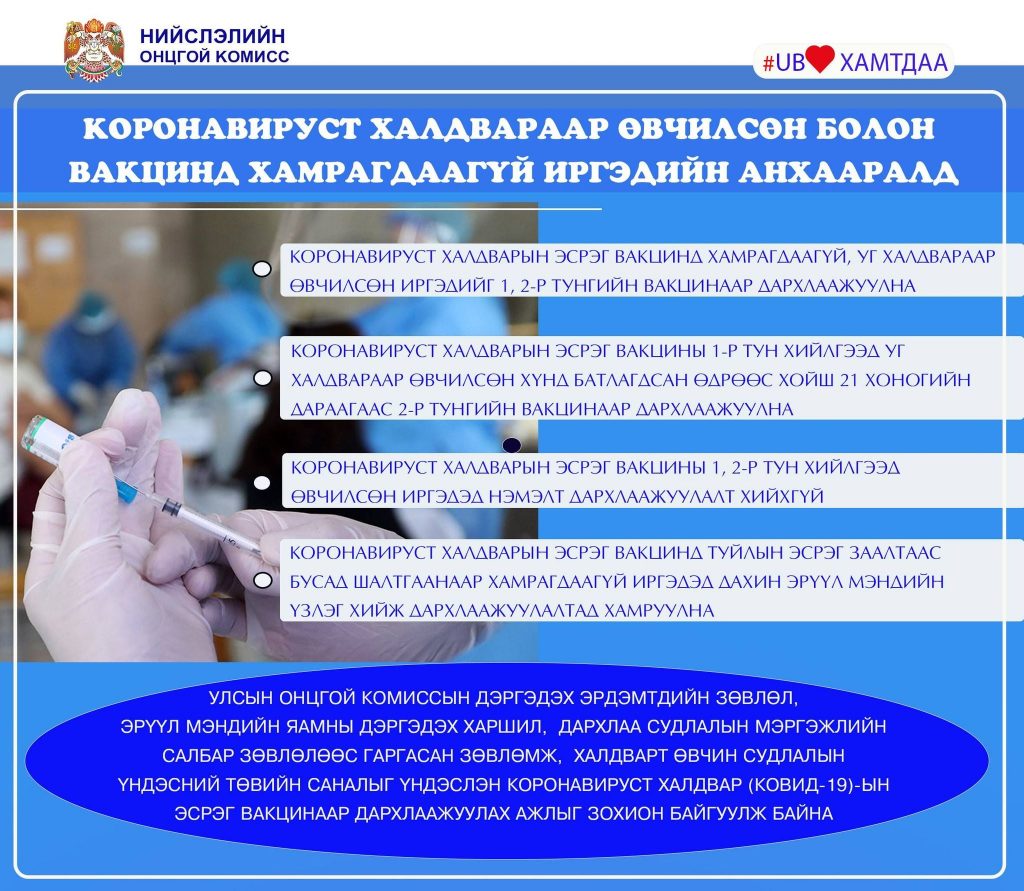 | Вакцины эхний тун хийлгээд халдвар авсан бол хоёр дахь тунг 21 хоногийн дараа хийлгэнэ |