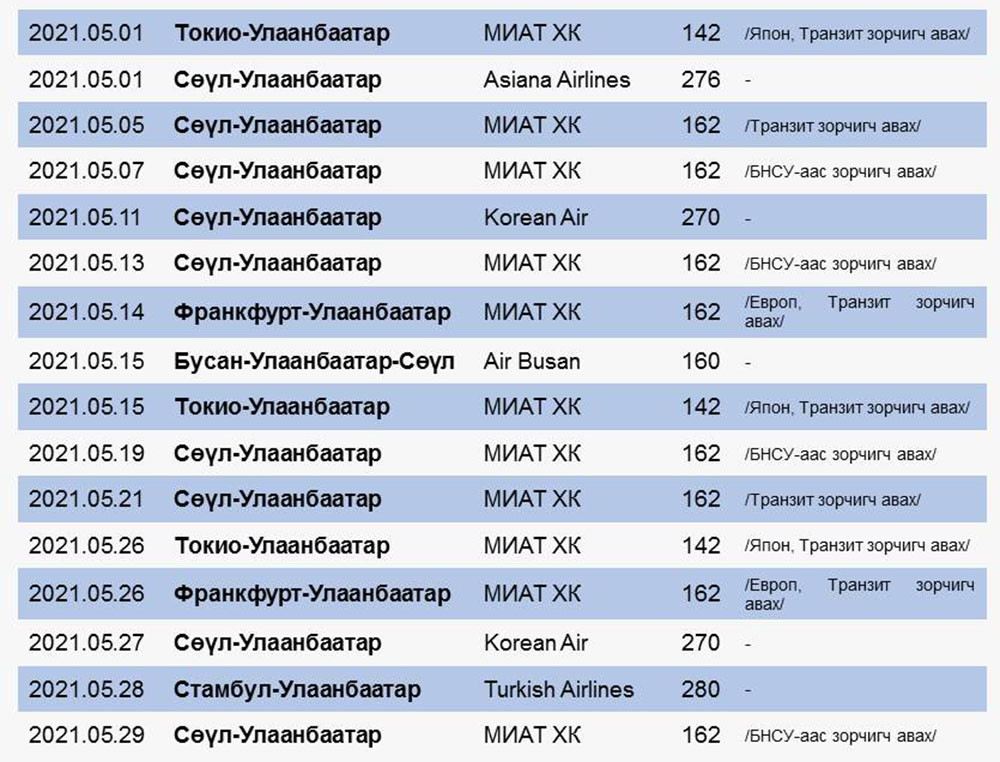 Манай улс энэ сард гадаадаас 2978 иргэнээ авахаар төлөвлөжээ. Уг хуваарийн дагуу Тавдугаар сарын 19-нд буюу ирэх лахагва гарагт Сөүл-Улаанбаатр чиглэлийн тусгай үүргийн нислэгээр 162 иргэнээ татан авах юм байна.