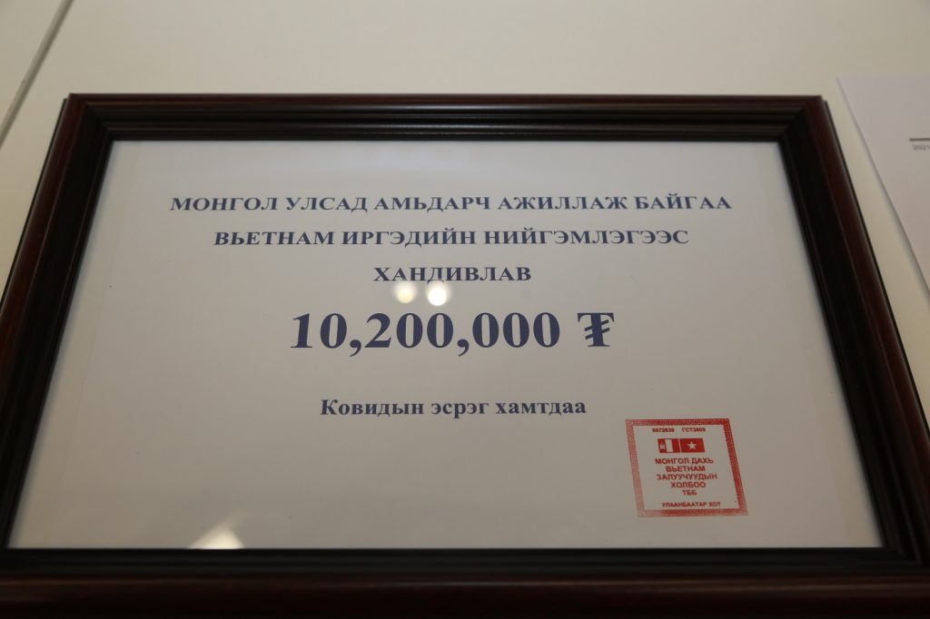 Нийт 100 гаруй Вьетнам иргэд ажиллаж, амьдардаг бөгөөд эдгээр иргэдийн сэтгэлийн хандив болгож 10,200,000 төгрөгийг УОК-т хүлээлгэн өгсөн юм гэж УОК-ын Шуурхай штабаас мэдээллээ.