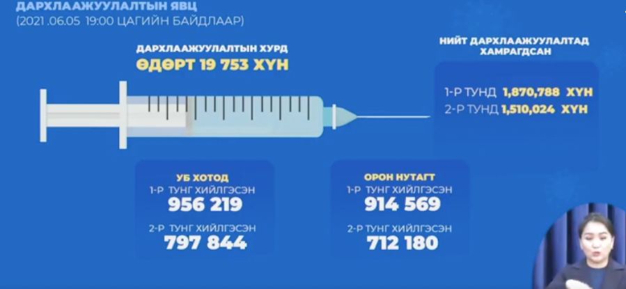 Сүүлийн 24 цагт 19.753 хүн дархлаажуулалтад хамрагдсан байна. Улаанбаатар хотод 956.219 хүн эхний тунд, 797.844 хүн хоёрдугаар тундаа хамрагджээ. Ингэснээр Улаанбаатар хотын нийт дархлаажуулалтад хамрагдах ёстой хүмүүсийн 83.7 хувь вакцинаа бүрэн хийлгэсэн байна.