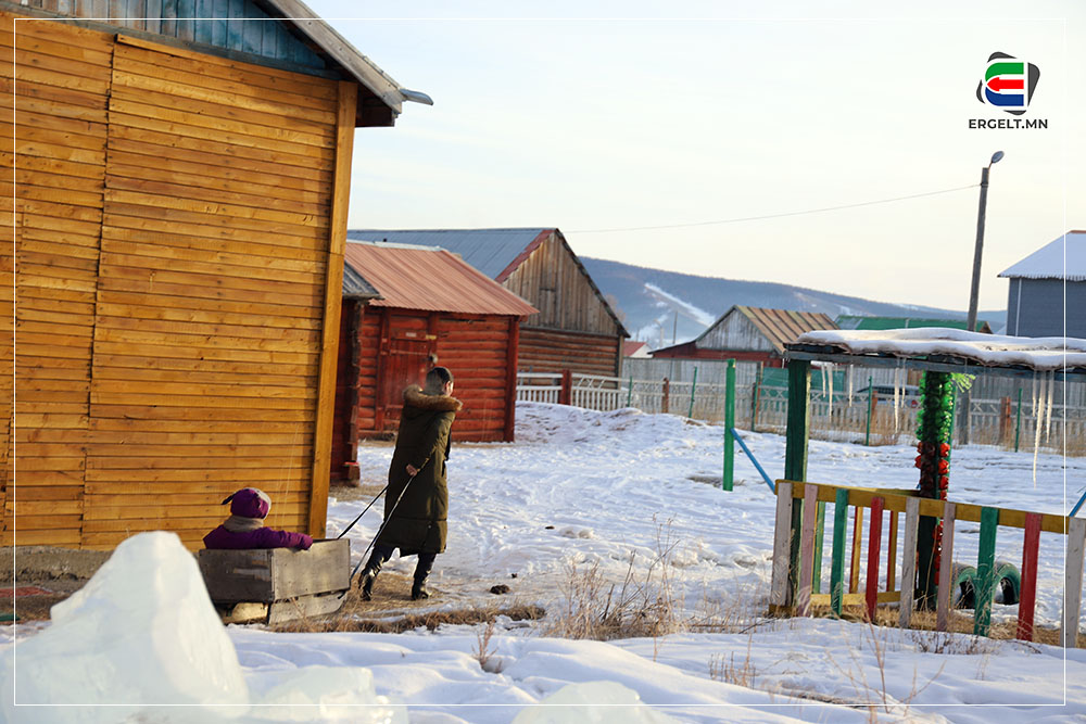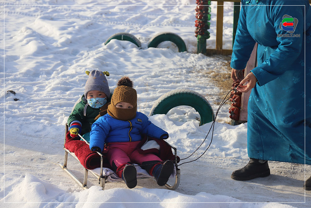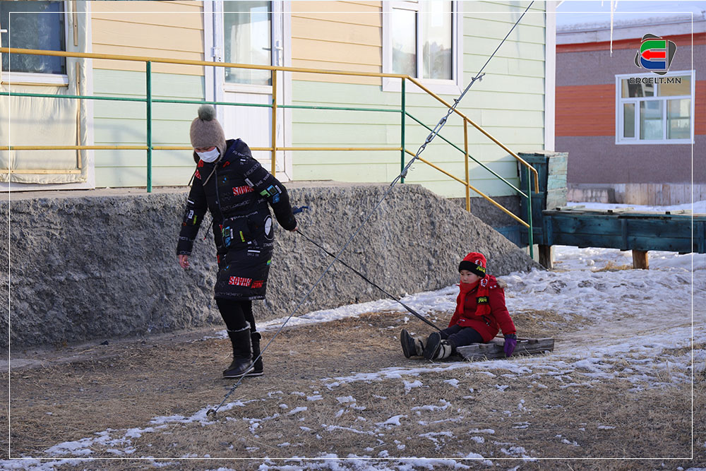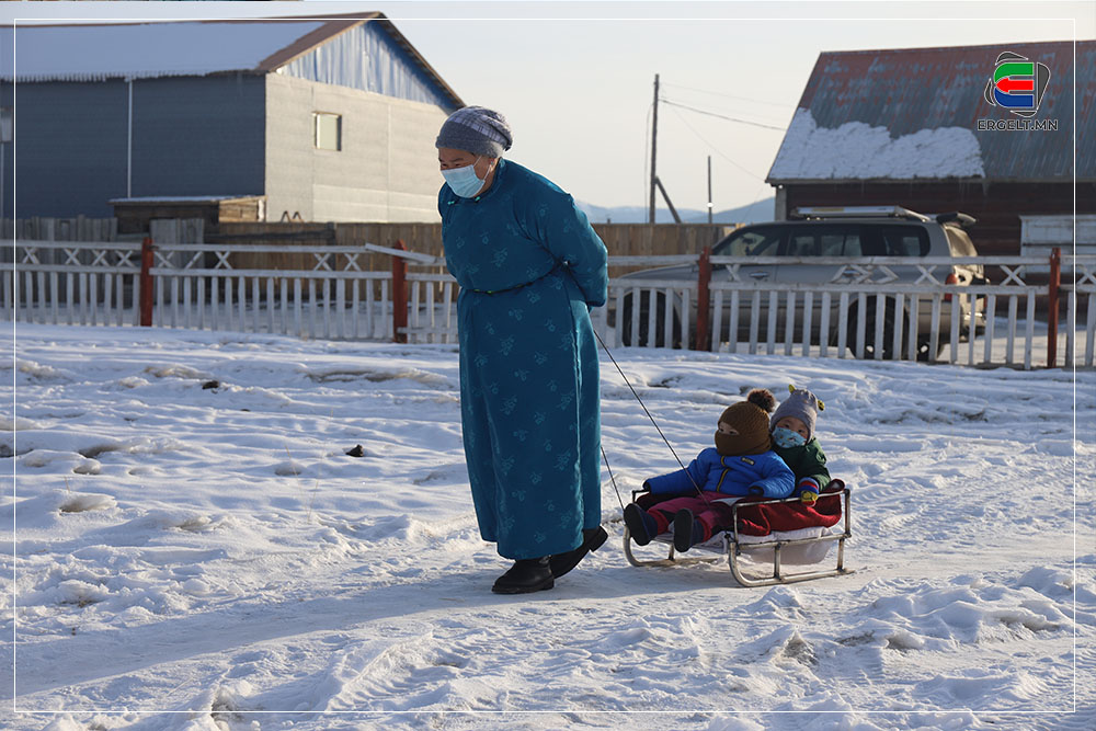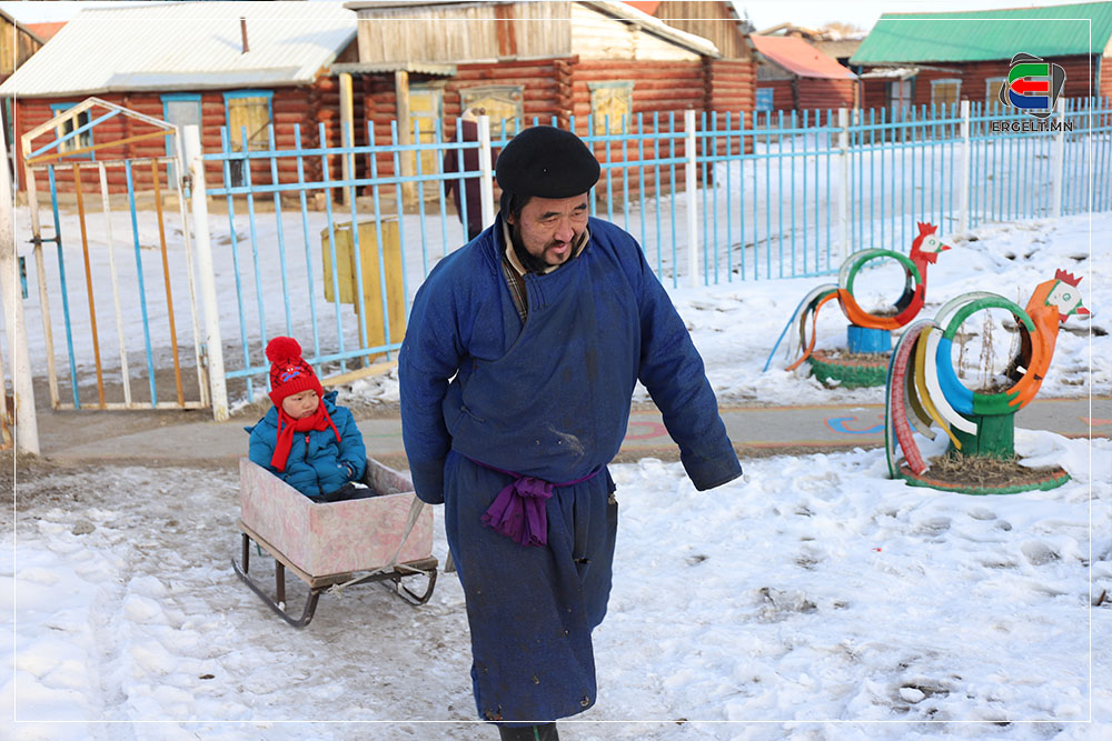 70 гарч яваа болов уу гэмээр настай эмээ хоёр ихэр ачаа чарган дээр суулгачихаад сумын цэцэрлэгийг зүглэж явна. Эмээ нь ач нараа чаргаар цэцэрлэгт нь хүргэх “даалгавар”-ынхаа замд хоёр ч амсхийж харагдав. Ач нар руугаа нэг харж инээгээд эргэн сумын төвийг хэсэг саравчлан харж байгаад л хөдлөх аж. Тэгж яваад эмээ танилтайгаа таарч хэдэн хором сумын төвийг хуучилж байна. Танил эмээ ч бас ач охиноо цэцэрлэгт хүргэхээр яваа аж. Цэцэрлэгийн ахлах бүлгийн гэмээр том охин цолгиун дуугаар “Эмээ хурдлаач дээ” гээд л гомдоллож гомдоллож эцэст нь хэсэг ярьж зогссон хоёр хөгшин хөдлөхөөр болов.