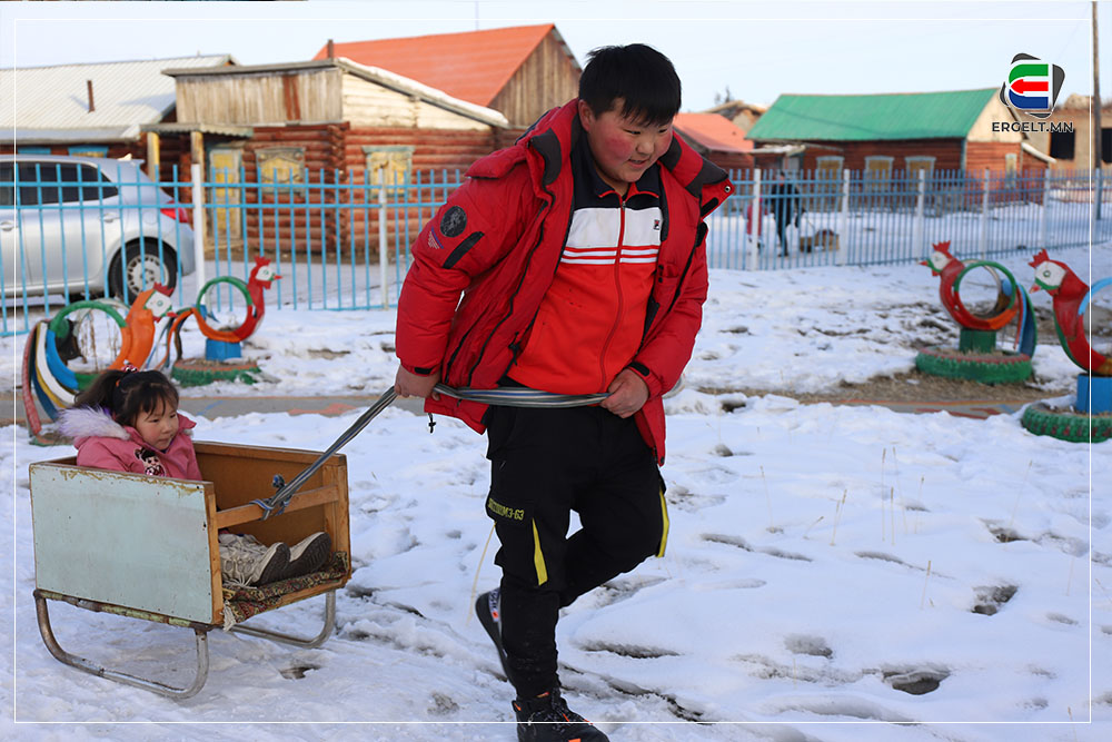 Цэцэрлэг тарах цаг ч болж, багачууд дулаан жийрэгтэй чарган дээрээ тухтай гэгч нь сууж байна. Тэгсэн гурав орчим настай гэмээр нэг хүү “Чарган дээр суухаас ядарсан” гээд ааваасаа хөтөлж, аав хүү хоёр хоосон чаргаа чирээд явлаа. Мөн бага ангийн бололтой өөрөө “том” цүнх үүрсэн хүү дүүгээ хөтөлж гарч ирээд “Агаа нь өглөө чирсэн юм чинь одоо агаан дүү чирчих. Агаа нь суухгүй ээ” гээд тэрүүхэндээ бяцхаан заль гаргаж, дүүгээрээ чаргыг нь чирүүлээд цэцэрлэгийн хашаанаас гарлаа.
