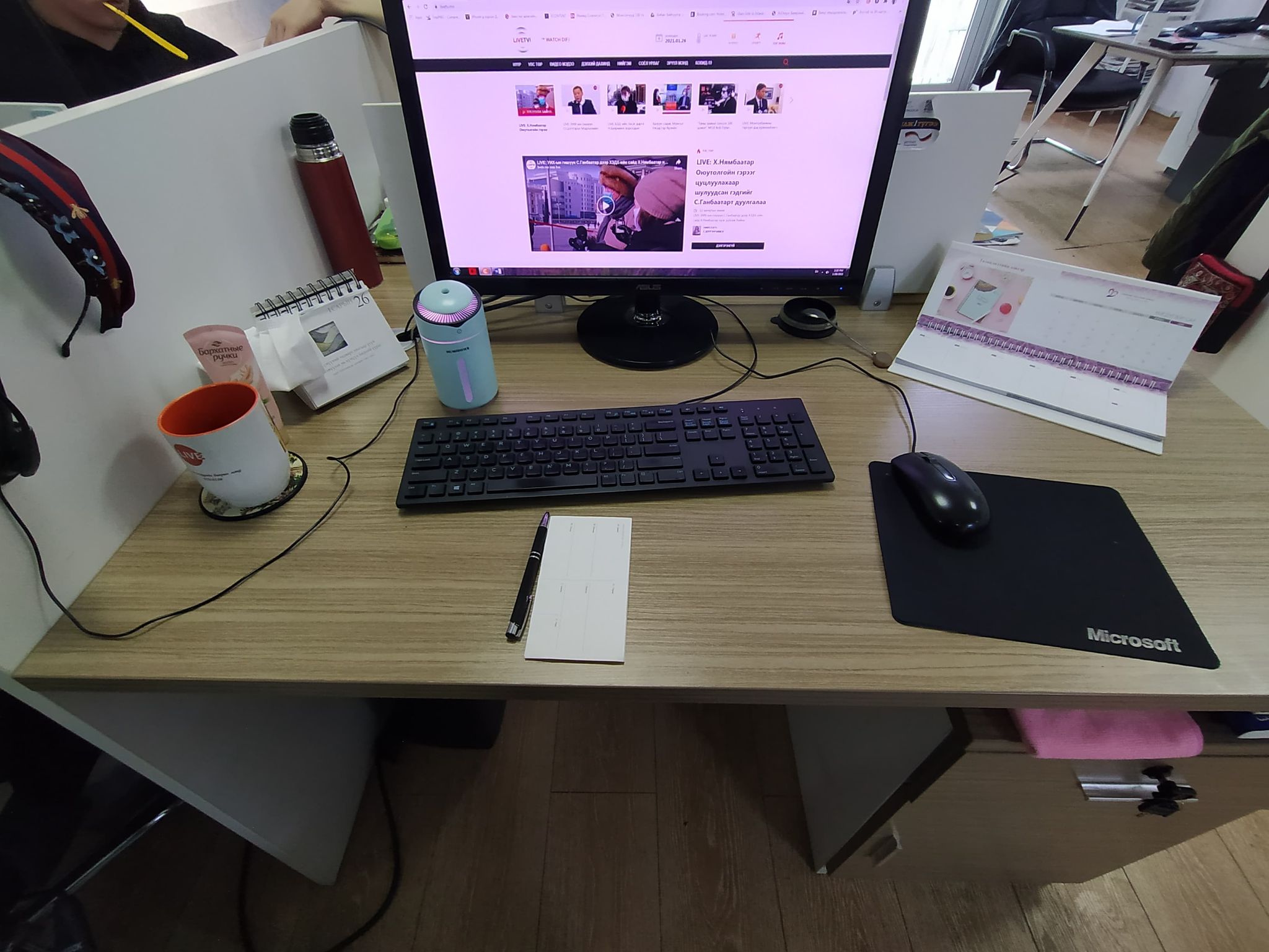 Би яг энэ ширээн дээр суугаад гурван сар болж байна. Саяхан нүүж ирсэн юм л даа. Ковидоос шалтгаалаад оффис дээр удаан суухгүй байгаа. Энгийн үед бол өглөө 07:00 өнгөрөөж очоод 18:00 цагийн үед ажлын ширээнээсээ босдог. Тэгэхээр өдрийн 10 цаг гаруй хугацааг энэ ширээндээ өнгөрөөдөг юм уу даа.