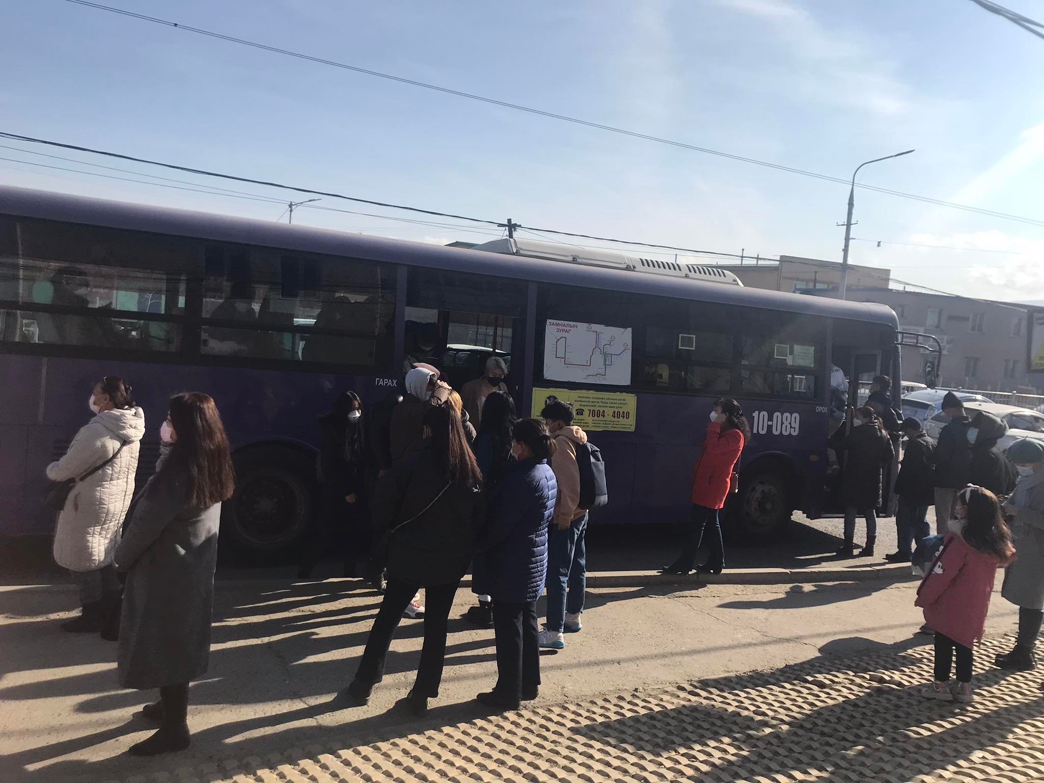 Үргэлжлүүлэн бид явсаар 17 дугаар автобусны буудал хүрэв. Нэгэн жигд амны хаалт зүүсэн хүмүүс автобус хүлээж зогсоно. Зарим нь чихэвчтэй дуу сонсож зогсох бол нөгөө хэсэг нь хоорондоо юм ярина. Энэ зуурт зарим нь байн байн утсаа шалгаж, суух чиглэлийн автобус нь хаана явааг харна. Эндээс ихэвчлэн долоон буудал, Чингэлтэй, Шаргаморьт чиглэлийн автобус явах бөгөөд хүн ихтэй байх аж. Хүн хоорондын зайн халдвар хамгааллын журам хэдийнэ алдагдаж, хүрэх газраа хүрч л байвал суугаад явна гэсэн хүмүүс их байх. Автобус ирээд зогсохоор хяналтын ажилтан “Картаа дараад яваарай. Бэлэн мөнгө өгөхгүй шүү, картгүй нь буу” гэхэд зарим нь огт тоосон шинжгүй автобус руу орж, хяналтын ажилтан араас нь орилж хоцорно. Ийнхүү нэг автобус яваад өнгөрөхөд автобусны буудал жаахан сийрэг болж ирээд, мөдхөн л дүүрчихнэ. Амралтын өдөр болохоор ихэнхдээ “Шарга-Морьт-Дүнжингарав” гэсэн автобус хүн ихтэй явах бөгөөд цагийн зайтай ирэх аж. Учир нь эл автобус эндээс Нарантуул зах руу шууд хүрдэг бөгөөд амралтын өдөр зах руу явах унаа л хамгийн их хүнтэй байх аж. Өмнө нь зах руу микро явдаг байсан бол одоо больж, тийш явах хүмүүс автобус бараадахаас өөр аргагүй болсон. Автобусны буудал дээр ерөөс карт болон ямар автобусанд суух тухай яриа л өрнөх бөгөөд даарсан хүмүүс гадуур хувцасныхаа хармаанд гараа шургуулан, ороолтдоо шигдэн дахиад л автобус хүлээн зогсоно.