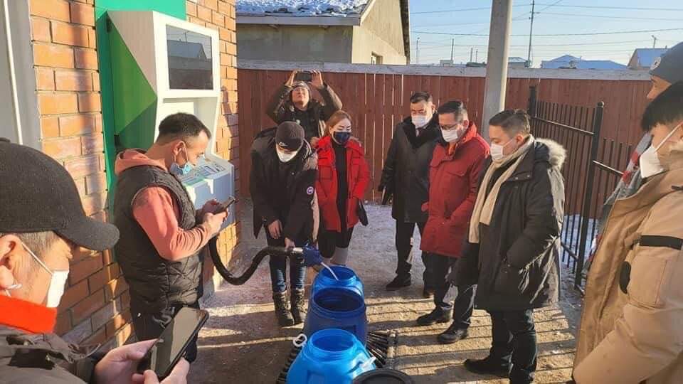 Шар өнгийн 25 литрийн хоёр сав, 50 литрийн мөн нэг дугуй сав тэргэн дээр түрж, хөх өнгийн шатахууны сав барьсан эмэгтэй, эрэгтэй хоёр худаг дээр ус авахаар ирэв. Тэд бүдэг хөх өнгийн смарт карт гаргаж ирээд ухаалаг худгийн төхөөрөмжид уншуулан, халуун, хүйтэн, зогсоох гэсэн гурван өнгийн товчлуурын улаан буюу халуун гэсэн товчлуурыг дарснаар эгнүүлсэн өнгийн савнууддаа ус дүүргэж гарав. Гэтэл эхний хоёр 25 литрийн сав дүүрээд л автоматаар ус хаагдчихав. Энэ талаар тэд “Одоо 30-40 минут хүлээж байж дараагийн савнууддаа ус авах юм чинь хоёр савтай усаа гэртээ авааччихаад хүрээд ирье” хэмээн ярина. Бид Налайх дүүргийн нэгдүгээр хорооллын уурхайчдын есдүгээр гудамжинд байрлах халуун усны худаг дээр ирсэн нь энэ.