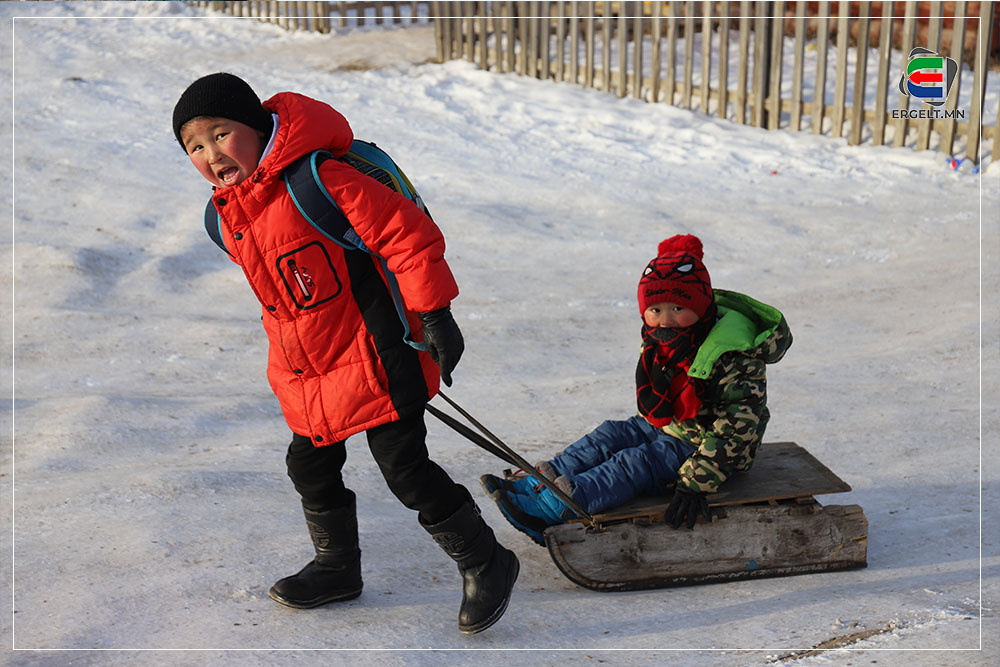 Цэцэрлэг тарах цаг ч болж, багачууд дулаан жийрэгтэй чарган дээрээ тухтай гэгч нь сууж байна. Тэгсэн гурав орчим настай гэмээр нэг хүү “Чарган дээр суухаас ядарсан” гээд ааваасаа хөтөлж, аав хүү хоёр хоосон чаргаа чирээд явлаа. Мөн бага ангийн бололтой өөрөө “том” цүнх үүрсэн хүү дүүгээ хөтөлж гарч ирээд “Агаа нь өглөө чирсэн юм чинь одоо агаан дүү чирчих. Агаа нь суухгүй ээ” гээд тэрүүхэндээ бяцхаан заль гаргаж, дүүгээрээ чаргыг нь чирүүлээд цэцэрлэгийн хашаанаас гарлаа.