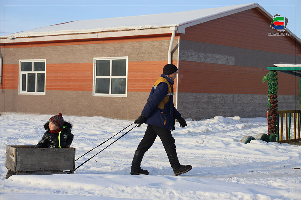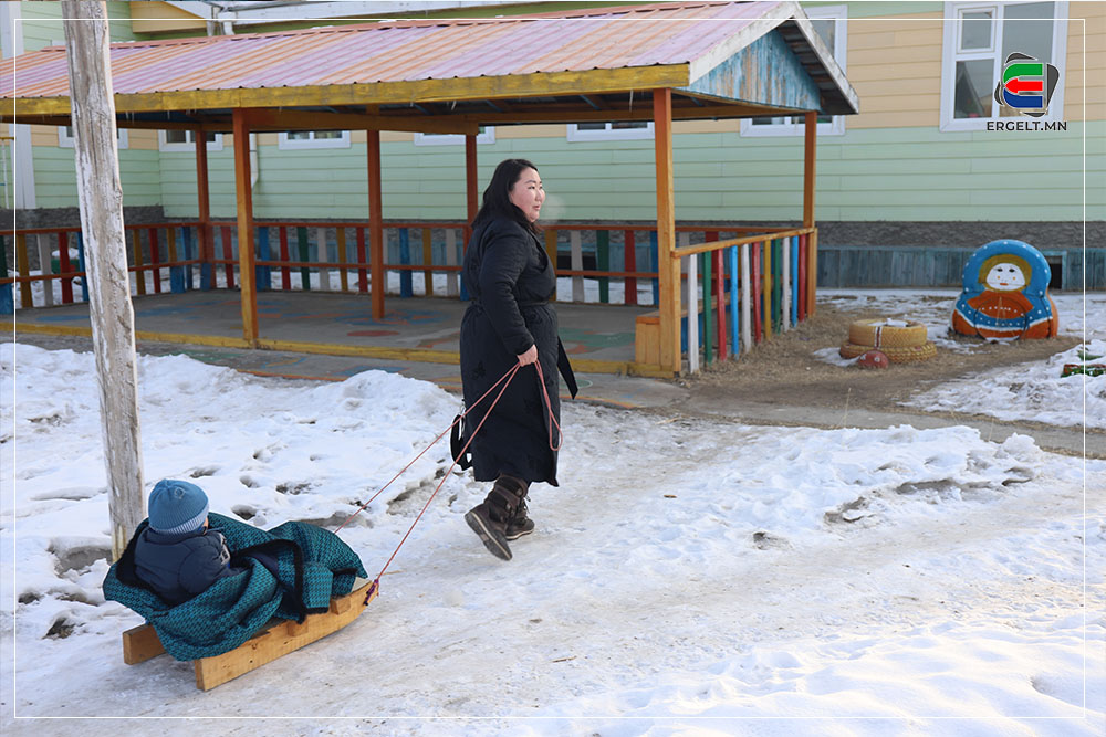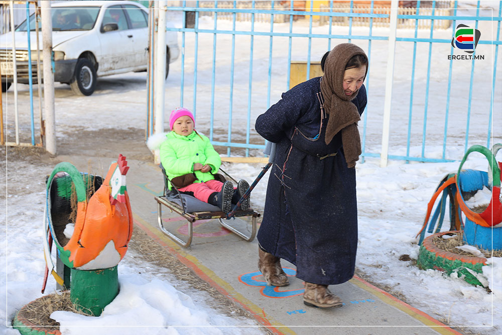 70 гарч яваа болов уу гэмээр настай эмээ хоёр ихэр ачаа чарган дээр суулгачихаад сумын цэцэрлэгийг зүглэж явна. Эмээ нь ач нараа чаргаар цэцэрлэгт нь хүргэх “даалгавар”-ынхаа замд хоёр ч амсхийж харагдав. Ач нар руугаа нэг харж инээгээд эргэн сумын төвийг хэсэг саравчлан харж байгаад л хөдлөх аж. Тэгж яваад эмээ танилтайгаа таарч хэдэн хором сумын төвийг хуучилж байна. Танил эмээ ч бас ач охиноо цэцэрлэгт хүргэхээр яваа аж. Цэцэрлэгийн ахлах бүлгийн гэмээр том охин цолгиун дуугаар “Эмээ хурдлаач дээ” гээд л гомдоллож гомдоллож эцэст нь хэсэг ярьж зогссон хоёр хөгшин хөдлөхөөр болов.