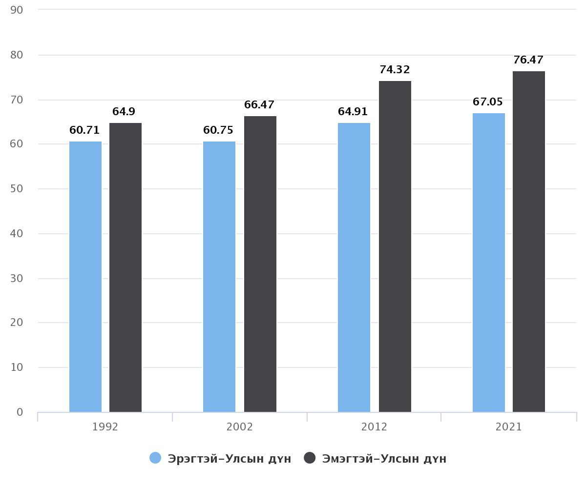 Үндэсний статистикийн хорооноос гаргасан “Хүн амын дундаж наслалт”-ын судалгаагаар 1992, 2002, 2012, 2021 онуудад эрэгтэй, эмэгтэй хүний дундаж наслалт нэмэгдэж буй зүй тогтолд ажиглагдаж байна. Энэ нь амьдралын чанар, хоол хүнс, хотжилт, иргэдийн эрүүл мэндийн боловсрол зэрэг олон зүйлс нөлөөлсний үр дүн боловч насжилт нэмэгдэхийн хэрээр өвчлөлийн төрөл, өвчлөлд өртөх магадлал нэмэгдэж байна гэдгийг эрүүл мэндийн салбарынхан онцолдог.