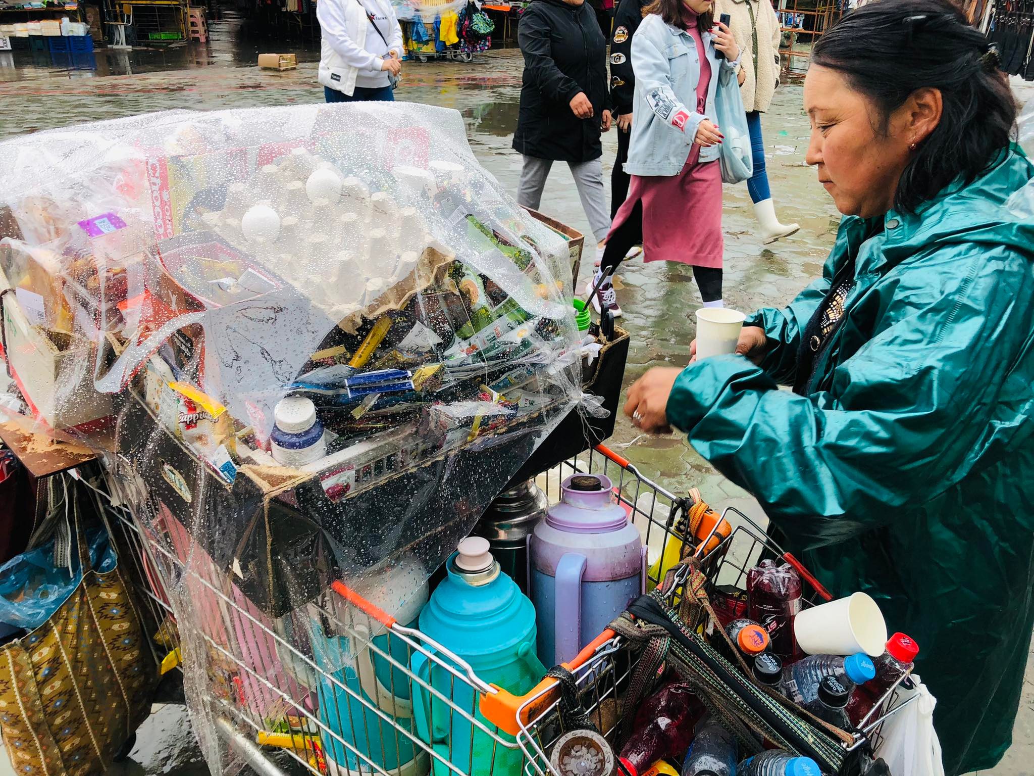 Захын хойд хэсгээс хоёр гартаа дүүрэн тортой зүйл барьчихсан ногоон цувтай эмэгтэй яаран алхана. Тэр бол Соко эгч. Лангууны худалдаачид өөрсдийн бараагаа өрж дуусахтай зэрэгцэн Соко эгч Нарантуул захын оёдолчид суудаг газраас гурван литрийн арав гаруй халуун саванд буцалсан усаа дүүргэж авна. Гурван литрийн нэг халуун сав усыг 700 төгрөгөөр тооцож авдаг бөгөөд өдөртөө хоёрхон л удаа сэлгэдэг. Тэгэхээр Нарантуул захын бороотой зэврүүн өдрийг Соко эгчийн хэдэн халуун сав ус, цай, кофенууд дулаацуулдаг гэхэд буруудахгүй биз ээ.