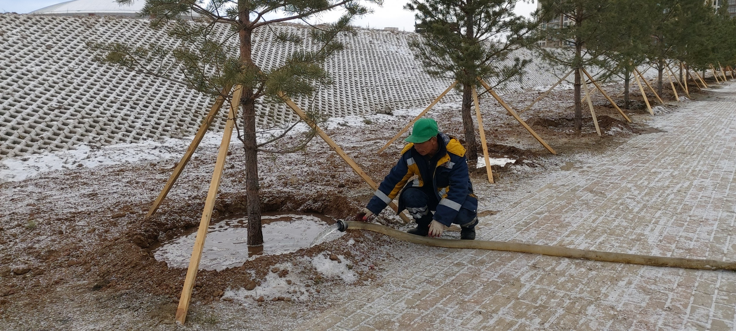 “Охь мандал” компанийн тохижуулсан дөрвөн замын уулзвараас Сансарын аюулгүйн тойрог хүртэлх ногоон байгууламж бүхий талбайн нөхөн сэргээлт, арчилгаа цэвэрлэгээг гурван ажилтан хариуцан цэвэрлэж байв. Тус хэсэгт 66 ширхэг улиас, 157 ширхэг нарс, бусад төрлийн бут сөөгөөр тохижилтыг баяжуулан зохион байгуулжээ. Харин Ард Аюушийн өргөн чөлөөний гудамжийг ганган ногоон гацуур модоор чимэглэж хотын өнгө үзэмжийг нэмэгдүүлэхээр тохижуулсан байлаа. Мөн троссон хашлагын эвдрэл гэмтлийг шалгаж, тасарсан болон шон нь далийсан хэсгийг сольж, харагдах байдлыг сайжруулж байв. Хашлагын эвдрэл, гэмтэл хариуцсан ажилтан Б.Балжиннямаас эвдрэл, хорогдол хэр гардаг талаар тодруулахад “Ногоон байгууламжийг битүү хашаагаар хашиж болох ч мод, ургамлыг бүрэн харагдуулах зорилгоор троссон хашлага хийдэг. Мөн санхүүд хэмнэлттэй байдаг. Троссон хашлага дээгүүр иргэд давах, машинаараа мөргөж унагаах зэрэг гэмтэл их гардаг. Тухай бүрт нь засаж бүтэн болгодог” хэмээв. Ерөнхий инженер “Охь мандал” ХХК-ийн тохижуулсан болон арчилгаа, үйлчилгээг хариуцдаг бүх зам талбай, ногоон байгууламжид ажиллаж буй хүмүүст заавар зөвлөгөө өгч, ажлын бүтээмжийг шалгаж, тодорхой чиглэл өгдөг байна. Мөн тус компанийн хариуцаж буй хуучин нисэх онгоцны буудлаас шинэ нисэх онгоцны буудал хүртэлх шинээр суулгасан нарс модыг бордоот усалгаагаар услах сүүлийн өдөр байв. Бид усалгаа дээр очиж хэрхэн усладаг талаар тодрууллаа. Мод услагч “Нэг тогоонд 80-100 литр ус ордог. Одоо усласан мод хөлдөж унтдаг. Харин хавар дулаан ороход мод сэргэж, ургалт нь нэмэгддэг. Мөн гандаж, гундсан модонд тусал хийж сэргээдэг” хэмээн дараагийн мод услахаар шаланкаа шилжүүлэв.