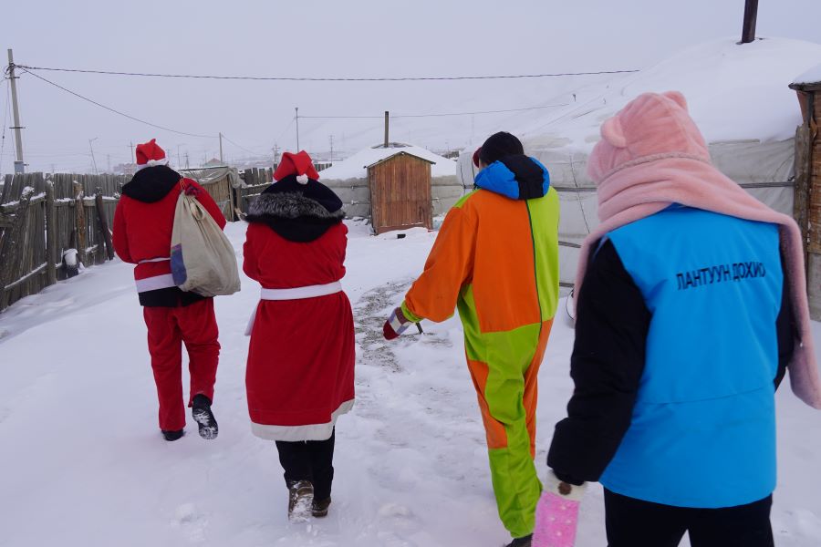 Хөр цасан дунд аж төрөх хэсэгхэн энэ газарт хүүхдийн инээд үргэлж цангинаж байхыг бид хүслээ. Мөрөөдөл, итгэл найдвар дүүрэн богцоо ачсаар сүүлийн замдаа орох зуур баруун гараараа байн байн чихээ даран дулаацуулах охин, дүүгээ хөтөлсөөр бидний замд таарав. Элэгдсэн гутал нь нэвт сийгж, хацар нь хөлдөх шахсан хоёр хүүхэд ээжийнхээ эзгүйд дэлгүүр ороод буцаж байгаа гэнэ. Бид сүүлчийн богцноосоо дулаан малгай, ороолттой хамт бэлэглэж, эгч дүүсийг жаварт булаалгахаас урьтсан юм. “Ээж ирэх болоогүй. Би дүүдээ амттан яваад явж байгаа юм. Та нарт баярлалаа ах, эгч нараа” хэмээн гайхахын зэрэгцээ баярлан инээмсэглэх охин эргэн эргэн харсаар цааш одлоо.
