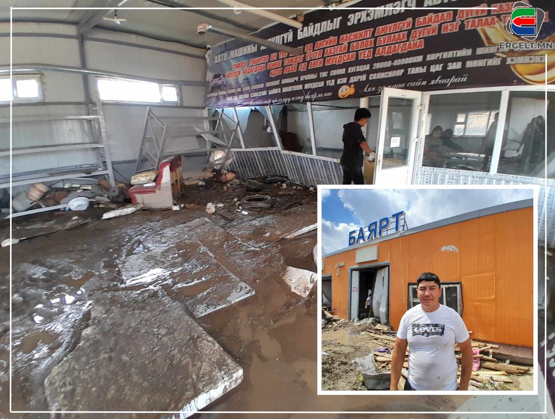 Автобусны буудал, төв зам дагуу холбогдох байгууллагууд цэвэрлэгээ, ариутгал хийгээд хөл хөдөлгөөн ихтэй. Зам дагуух дэлгүүр, зоогийн газрууд үерийн усаа шавхаад тун завгүй. “Оюу” хүнсний дэлгүүр үерийн улмаас хөргөгч, хөлдөөгчид нь байсан бүх бараанууд буудаж, үерийн усанд идэгдсэн гэнэ. Дэлгүүрийн эзэн Ц.Соёлмаа “Дэлгүүр хаах болоогүй болоогүй байсан учраас дэлгүүр дотроо байж байтал нэгэнт ундааны хөргөгчийн цаанаас ус олгойдоод урсаад ороод ирсэн. Хэдхэн минутын дотор дэлгүүр шал усаар дүүрсэн. Хөргөгч дотор үерийн ус ороод өдөр нь ирсэн зайрмаг, бууз, банш хэрэглэж, борлуулахын аргагүй болоод хаячхаад сууж байна. Өдөр нь 400 гаруй мянган төгрөгийн бараа татсан байсан. “Icemark”-ийн зайрмаг ирж амжаагүй байсанд нь үнэхээр баярлаж байна. Хэрэв ирсэн бол дахиад 800 гаруй мянган төгрөгөөр хохирох байж. Ус орсон хөлдөөгүүрүүд ажиллах эсэхэд үнэхээр санаа зовж байна. Дэлгүүрээ түрээслээд удаагүй учраас үнэхээр яахаа мэдэхгүй хэцүү л байна” гэв.