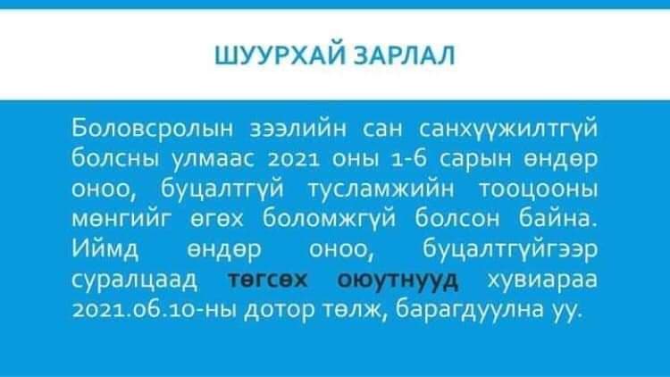 Боловсролын зээлийн сан санхүүжилтгүй болсны улмаас 2021 оны 1-6 дугаар сарын өндөр оноо, буцалтгүй тусламжийн тооцооны мөнгийг өгөх боломжгүй болсон. Иймд өндөр оноо болон буцалтгүй тусламжаар суралцаад төгсөж буй оюутнууд зургадугаар сарын 10-ны дотор төлөлт хийнэ гэх мэдээлэл гараад байна.