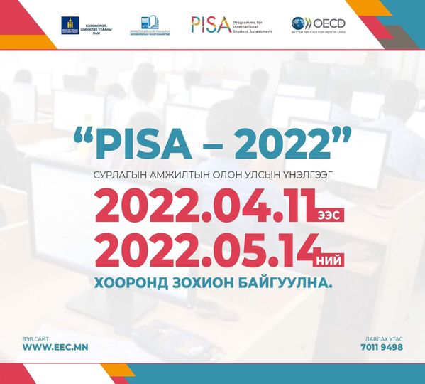“PISA – 2022” сурлагын амжилтын олон улсын үнэлгээнд манай улс компьютерт суурилсан хэлбэрээр оролцох ба судалгаанд хамрагдах сургууль, суралцагчийг түүврийн аргаар сонгоно. Сонгогдсон суралцагчид математик, байгалийн ухаан, унших, бүтээлч сэтгэлгээний даалгаврыг хоёр цаг, сурлагын амжилтад нөлөөлөх хүчин зүйлийг тодорхойлох асуулгыг 40 минутын хугацаанд хийж гүйцэтгэнэ.