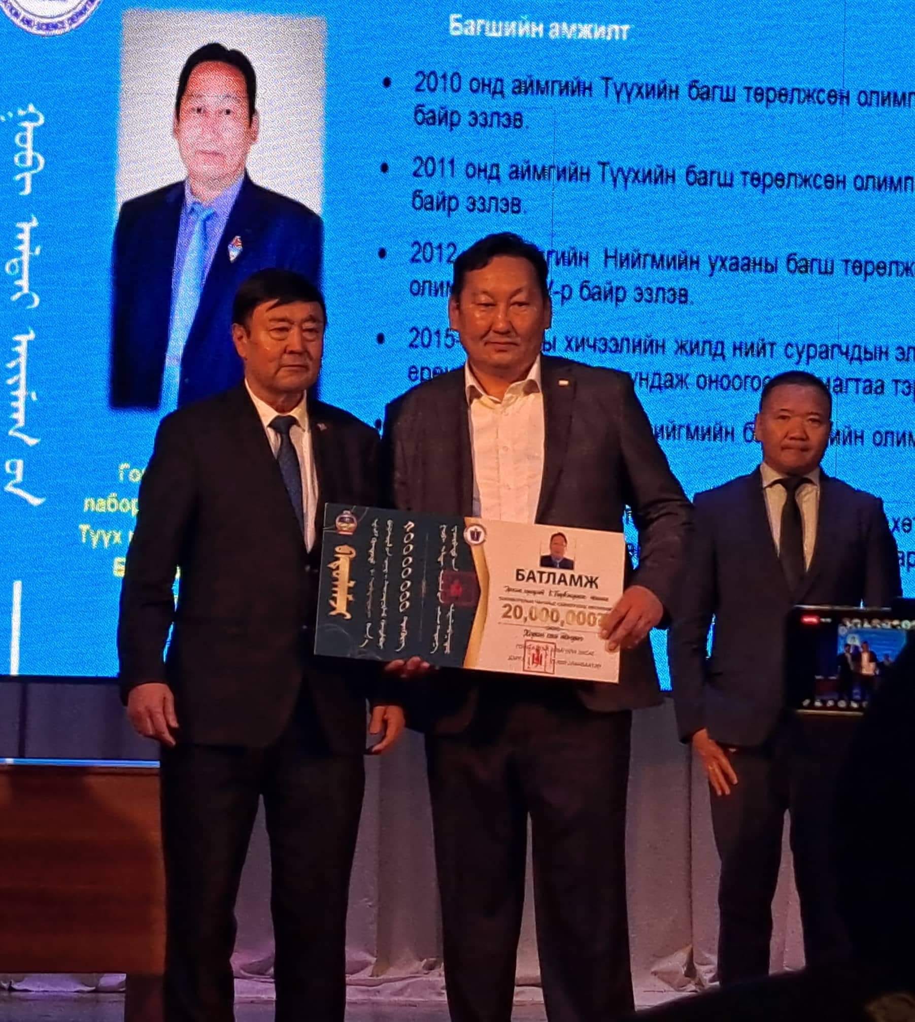 -Ёстой “шок” гэдэг шиг л юм боллоо. Багш нарын баяр болохоор багш нарыг шагнаж л байдаг. Гэхдээ ийм өндөр урамшуулал олгоно гэж бодоогүй. Нэрийг минь дуудсан чинь итгэж өгөхгүй байсан шүү. Гайхах, баярлах зэрэгцсэн зүйл боллоо. Надаас гадна мөн хоёр багш 20 сая төгрөгөөр шагнуулсан. Мөн Элсэлтийн ерөнхий шалгалтад 800 оноо авсан гурван хүүхдийн эхний жилийн сургалтын төлбөрийг төлөх эрхээр шагнасан. Мөн 600-гаас дээш оноо авсан хүүхдүүдэд мөнгөн шагнал олгосон. Нэг сурагч нь Түүх, нийгмийн чиглэлээр 800 оноо авсан байгаа.