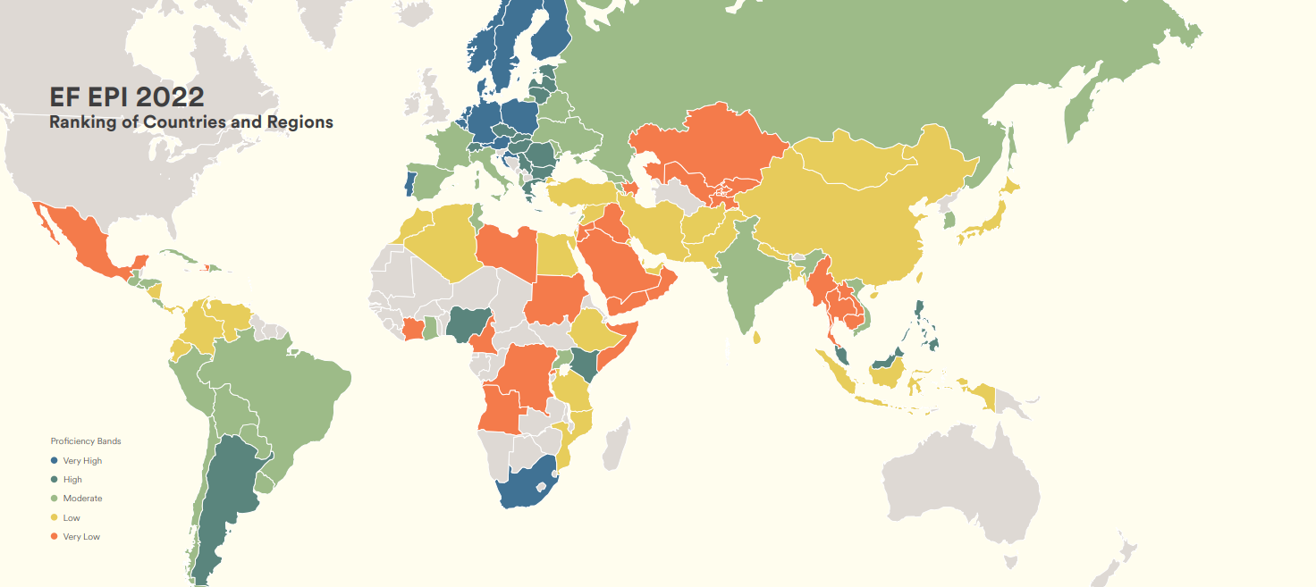 EF нь гадаад хэлний сургалтаар мэргэшиж ажиллаад 58 жил болж буй бөгөөд жил бүр улсуудын Англи хэлний түвшинг жагсааж, хөгжлийн үзүүлэлтүүдтэй нь уяж харуулдаг билээ. Өдгөө 2.5 тэрбум хүн Англи хэлээр ярьж байгаа ба тасралтгүй нэмэгдсээр байна. 2022 оны жагсаалтанд хоёрдугаарт эрэмблэгдсэн Сингапурыг эс тооцбол Европын өндөр хөгжилтэй орнууд эхний 10 орныг эзэлжээ. Энэ эрэмбэ сүүлийн 20 шахам жилд төдийлэн өөрчлөгдөөгүй билээ. Харин Монгол Улс 111 орноос 72 дугаарт жагссан байна. Энэ нь 2020 оны үетэй харьцуулбал зургаан байраар урагшилсан үзүүлэлт юм.