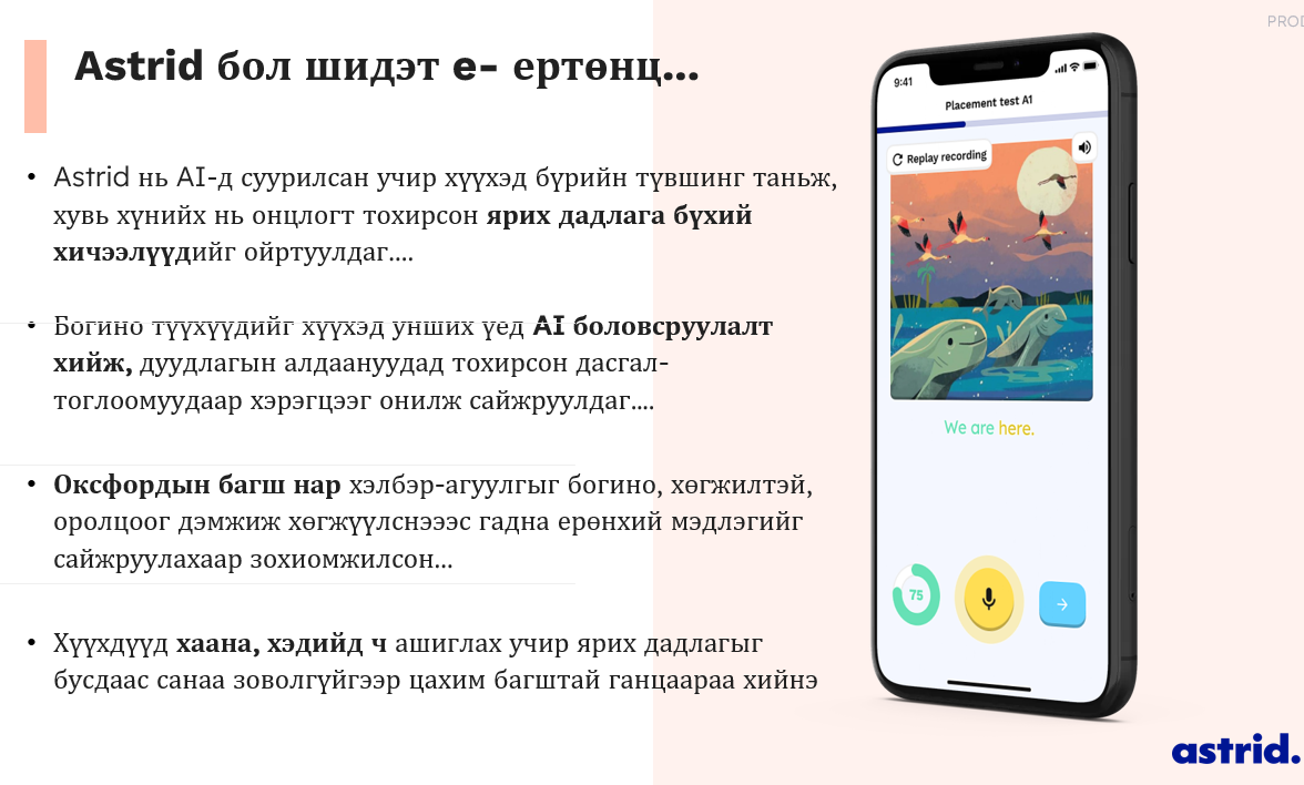 Яг одоо Гүрэн Академи нь Монгол орон даяар Astrid хэмээх хиймэл оюунд суурилсан Англи хэлний ярианы чадвар хөгжүүлдэг аппликейшнийг улсын сургуулийн 5-12 дугаар ангийн хүүхдүүдэд үнэгүй ашиглуулж байна. Ашиглаад эхэлсэн 10 мянган хүүхдийн оролцоог харахад Англи хэл суралцаж эхэлсэн 5-6 дугаар ангийн хүүхдүүд илүү идэвхтэй байгаа бол төгсөх анги руу дөхөх тусам хүүхдүүдийн идэвх буурч байгаа нь ажиглагдаж байна.