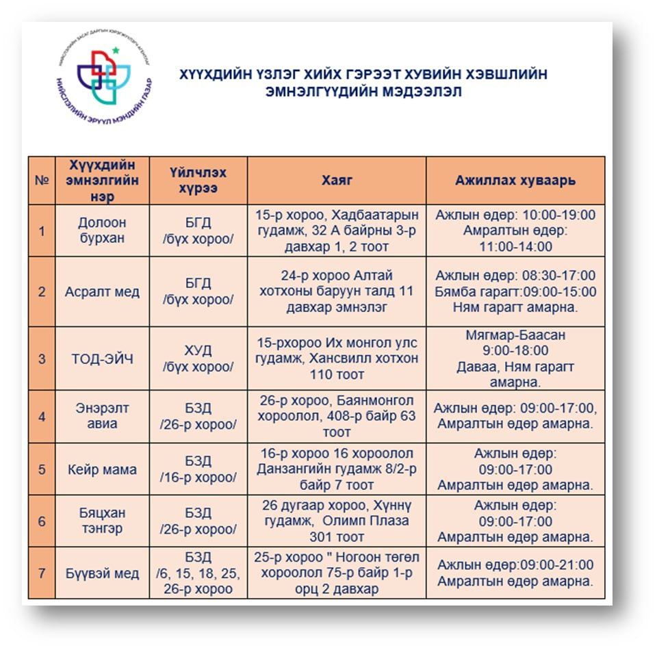 | ТАНИЛЦ: Харьяа дүүргийн хүүхдийн үзлэгийг үнэгүй хийх эмнэлгүүд |