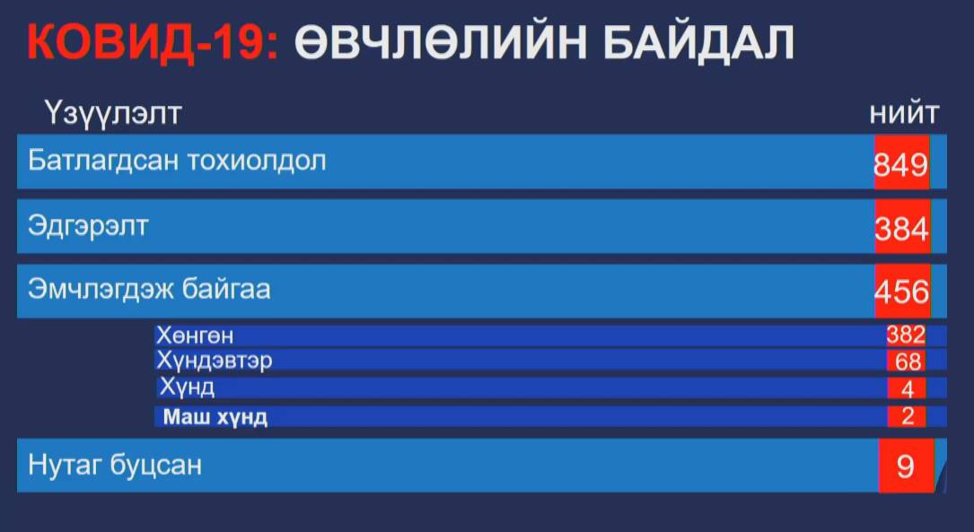 ХӨСҮТ-ийн тандалт судалгааны албаны дарга А.Амбасэлмаа “ХӨСҮТ, ЗӨСҮТ-ийн вирус судлалын лабораторид 14 мянга 19 хүнд шинжилгээ хийснээс долоон хүнээс халдвар илэрсэн. Тодруулбал, Сэлэнгэ аймагт дөрвөр, Дорноговь аймагт гурван тохиолдол батлагдлаа” гэв. Ингэснээр улсын хэмжээнд батлагдсан тохиолдол 849 болж байна.