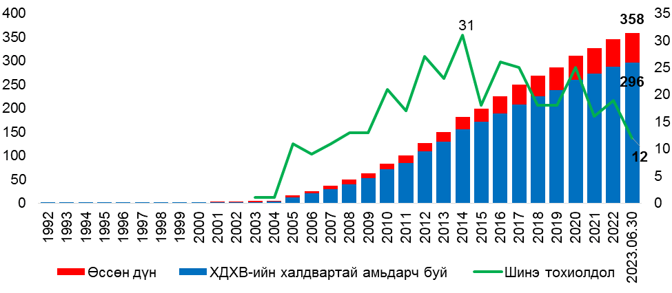Зураг 6. ХДХВ-ийн халдварын тохиолдлын тоо, шинэ тохиолдлын тоо өссөн дүнгээр (2023 оны зургадугаар сарын 30-ны өдрийн байдлаар)