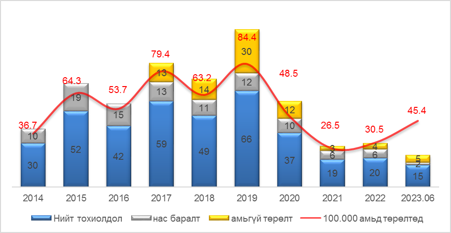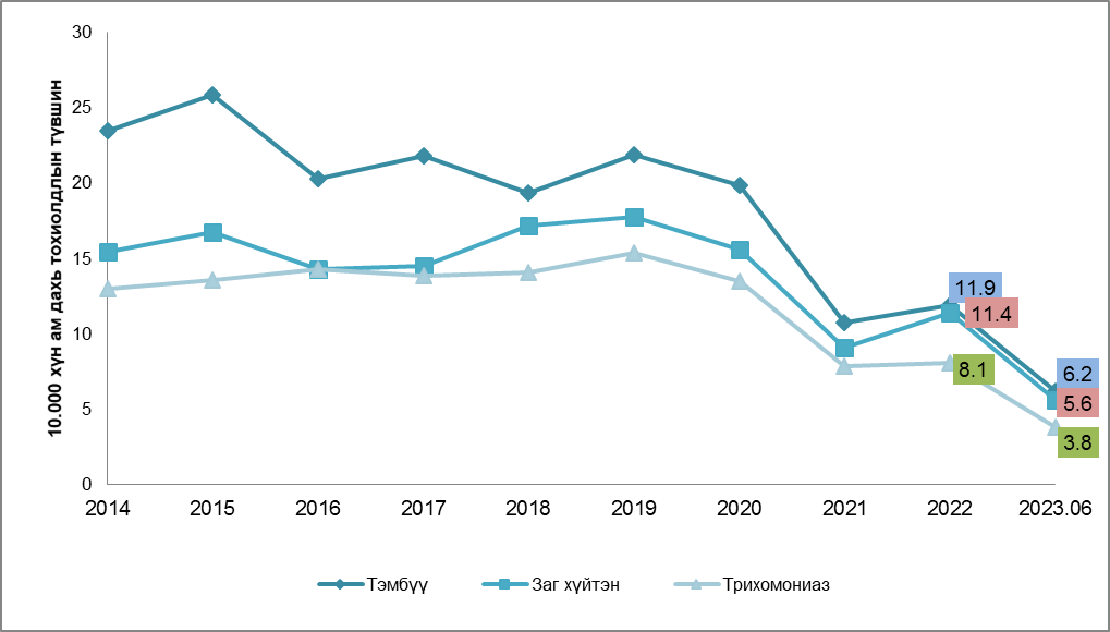 2023 оны эхний зургаан сарын байдлаар улсын хэмжээнд зонхилон тохиолдох бэлгийн замаар дамжих халдварын 5407 тохиолдол бүртгэгдсэн байна.Нийт өвчлөлийн 39.4%-ийг тэмбүү, 36%-ийг заг хүйтэн, 24.4%-ийг трихомониаз, 0.2%-ийг ХДХВ/ДОХ-ын халдвар тус тус эзэлж байна. Өнгөрсөн оны мөн үетэй харьцуулахад тэмбүүгийн өвчлөл 147 тохиолдлоор өссөн.Үүнийг 10,000 хүн амд ногдох өвчлөлтэй харьцуулбал, Архангай, Говьсүмбэр, Өвөрхангай, Баянхонгор аймгууд болон Улаанбаатар хотод улсын дундаж үзүүлэлтээс 0.2-9.5 хувиар өндөр байгаа аж.