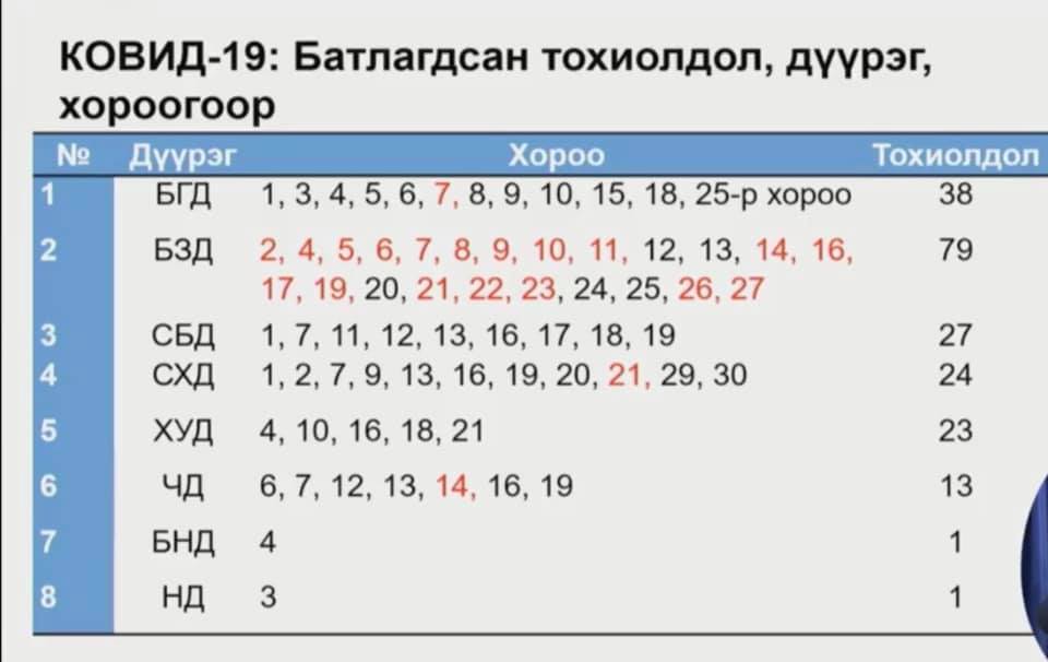 Баянзүрх дүүргийн VII дугаар хороонд мөн халдварын голомт үүсч, судалгааны баг гарган ажиллаж байгаа гэнэ. Мөн тус дүүргийн 28 хорооны 20 цэг дээр өнөөдрөөс эхлэн иргэдийг шинжилгээнд хамруулах ажлыг хийж эхэлжээ. Шинжилгээний цэг тус бүрт төв эмнэлэг, төрөлжсөн мэргэжлийн эмнэлэг, дүүргийн эрүүл мэндийн төвийн эрүүл мэндийн ажилтан, мэргэжлийн хяналтын байцаагч, цагдаагийн алба хаагч ажиллаж буй аж.