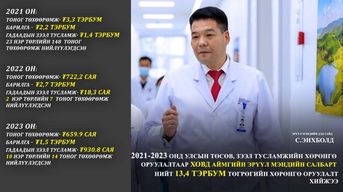 | Ховд аймгийн эрүүл мэндийн салбарт 2021-2023 онд 13.4 тэрбум төгрөгийн хөрөнгө оруулалт хийжээ |