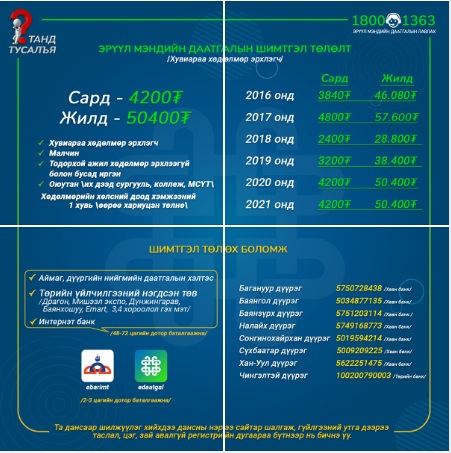 -Эрүүл мэндийн даатгалын тухай хуулиар иргэн бүр эрүүл мэндийн албан журмын даатгалд заавал даатгуулах үүрэгтэй. Албан журмын даатгал нь даатгуулагчийн төлсөн шимтгэлийн хэмжээнээс үл хамааран эрүүл мэндийн улмаас учирч болзошгүй санхүүгийн эрсдэлийг хуваалцах эв санааны нэгдлийн зарчимд тулгуурладаг.