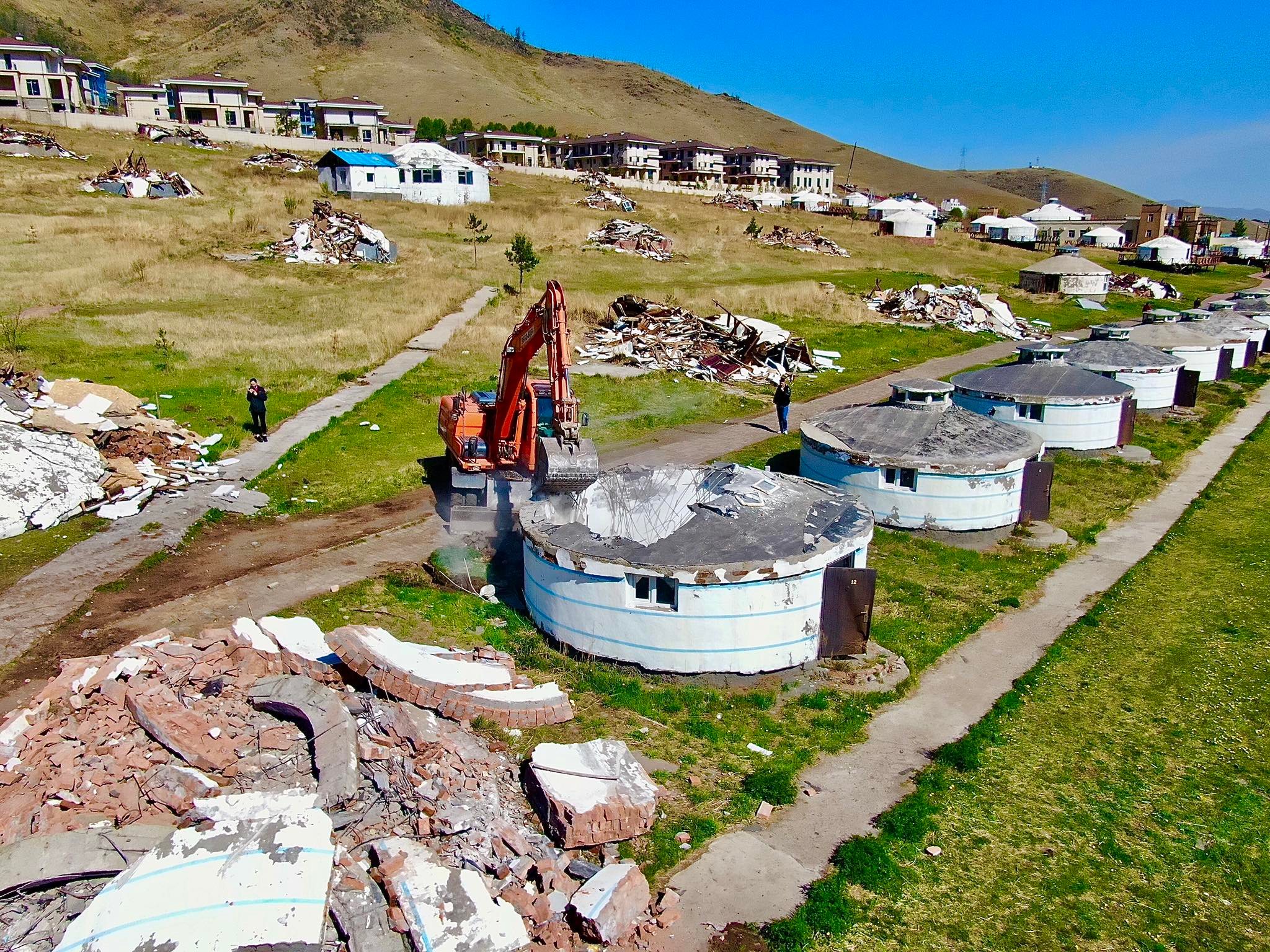 | Дугуй цагаан орчмын шавар гэрүүдийг буулгаж эхэллээ |
