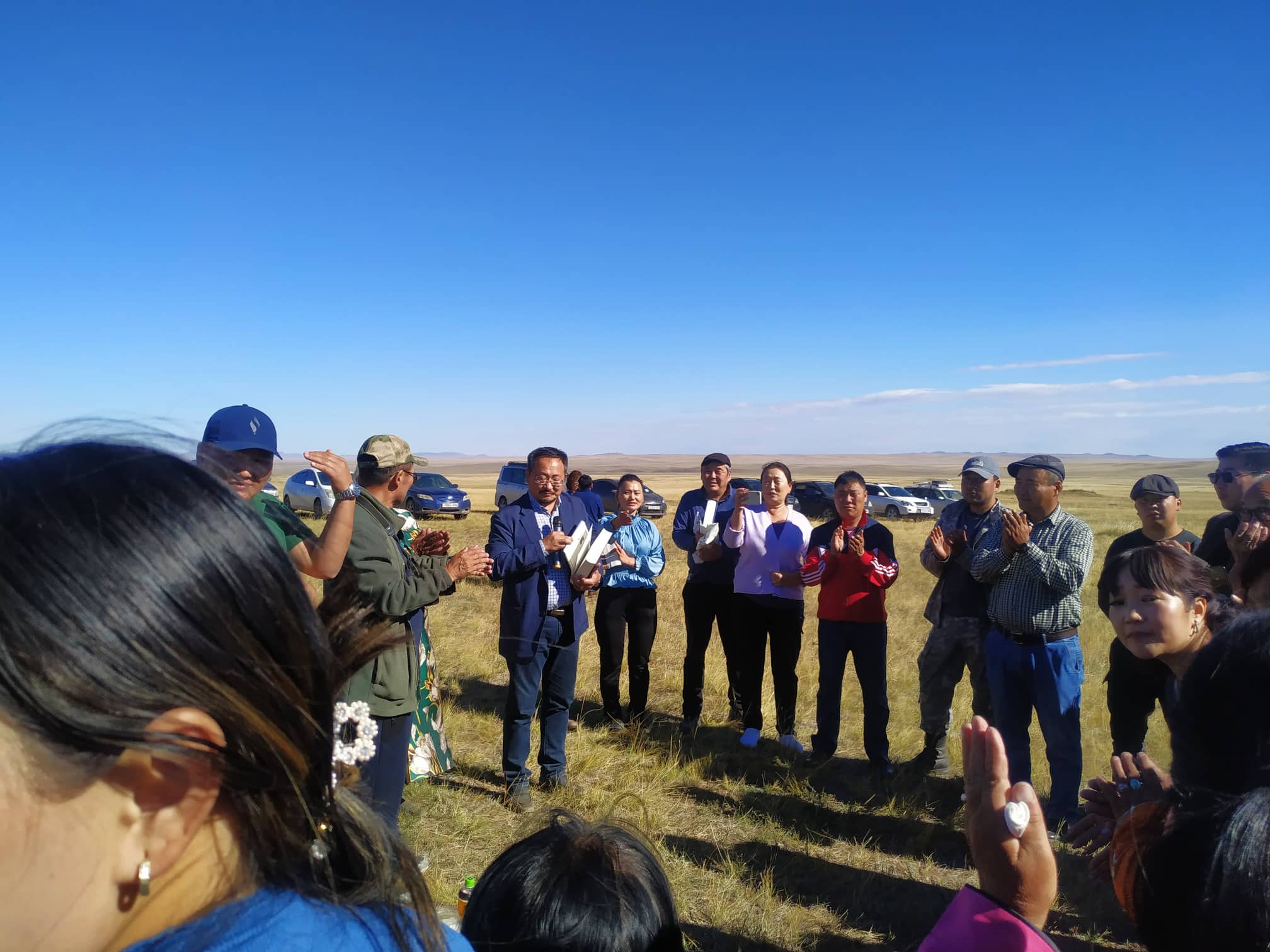 Налайх дүүргийн наад довцогт байрлах "Оргил" худалдааны төвийн зогсоолд автобус зогслоо. Нэлээд өндөрт хөөрсөн нар цацраг бүрээрээ туяарч байлаа. Автобуснаас буутал яруу найрагч Т.Амар-Амгалан “Ах нь хотод ирээд хоёр, гурав хонож байна. Ойрын үед сэрүүхэн байсан. Өнөөдөр харин дулаахан сайхан өдөр болох нь дээ. Удахгүй эхнэр маань Япон явах гэж байгаа” хэмээн хуучилж зогстол М.Амархүү ах марсайтал инээсээр бидний дэргэд ирэв. Яруу найрагч М.Амархүү ах нэлээд шогч, наргианч хүн болохоор аян замд хамт явахад хөгжилтэй гэж жигтэйхэн. "Болор цом"-ын эзэн яруу найрагч О.Цэнд-Аюуш ах газар доргиох мэт лагс лагс алхангаа тамхи татаж яваа харагдана. Харин Х.Нямхишиг, Н.Минжинсайхан ах нар хооронд хол ойрын сонин яриад, учиргүй инээлдэж харагдлаа. Ийн байтал автобусны дун бүрээ хариглаж, хөдлөх болсныг сануулав. Бид уван цувсаар автобусандаа сууж, Хэнтий аймгийн шаргалхан тал нутгийг зорихоор хөдөллөө.