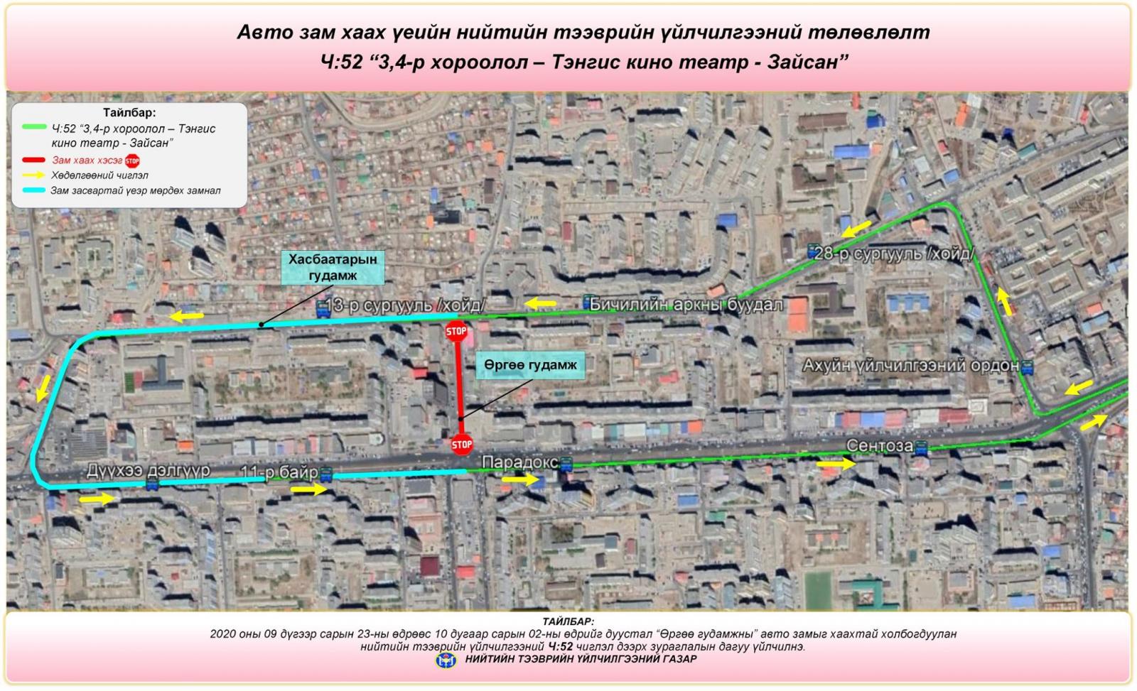 Мөн автозам засварын ажил хийгдэх явцад нийтийн тээврийн үйлчилгээний Ч:52 "3.4 хороолол-Тэнгис кино театр-Зайсан" чиглэлээр зорчих иргэд доорх зураглалын дагуу зорчих хөдөлгөөнөө төлөвлөнө үү.