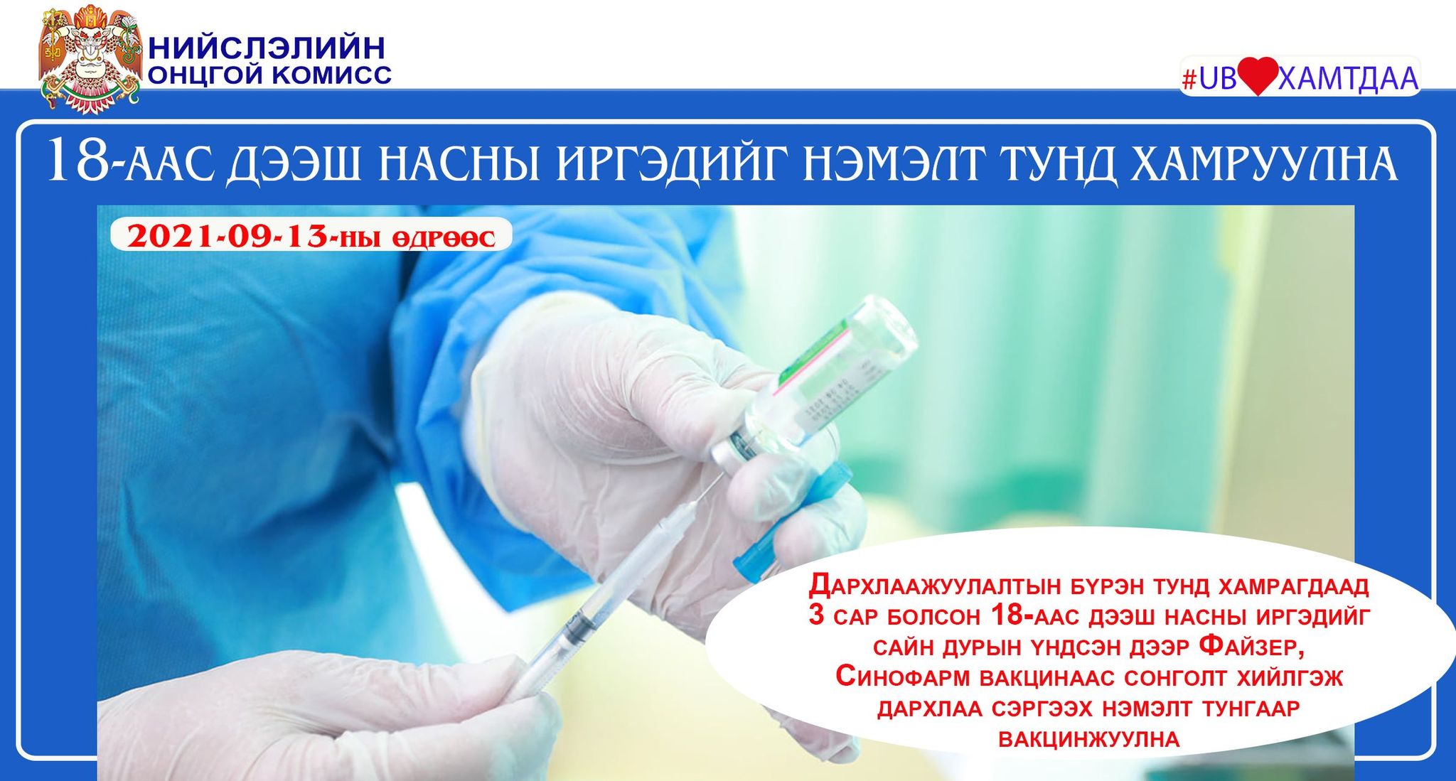 “Ковид-19” халдварын эсрэг дархлааны түвшнийг нэмэгдүүлэх зорилгоор есдүгээр сарын 13 буюу өнөөдрөөс 18-аас дээш насны иргэдийг нэмэлт гурав дахь тунгаар вакцинжуулахаар боллоо. Эрүүл мэндийн сайдын тушаалд зааснаар нэмэлт тун хийлгэх иргэнд коронавирусийн халдварын эсрэг вакцины хоёр тунд бүрэн хамрагдсан, хоёр дахь тунг тарьснаас хойш гурван сар өнгөрсөн байх шалгуур тавьж байгаа юм. Шалгуурт нийцсэн иргэнийг “Пфайзер” үйлдвэрийн комирнэти, “Синофарм” үйлдвэрийн corv вакцинаас сонголт хийлгэж, дархлаа сэргээх тунгаар вакцинжуулна.