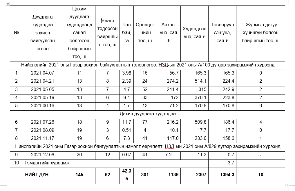 Нийслэлийн Засаг даргын 2021 оны А/829 дүгээр “Газар эзэмшүүлэх, ашиглуулах эрхийн дуудлага худалдааг зохион байгуулах тухай” захирамжийн хүрээнд 2021 оны арванхоёрдугаар сарын 6-ны 09:00 цагаас 15:06:45 цагийн хооронд 26 байршилд цахим дуудлага худалдаа зохион байгууллаа. Эдгээр байршлаас 21 байршилд 41 иргэн, хуулийн этгээдээс оролцох хүсэлт ирүүлсэн бөгөөд дараах 12 байршилд ялагчид тодорч, нийслэлийн төсөвт 11.2 сая төгрөг төвлөрүүлэхээр болов. Үүнд: