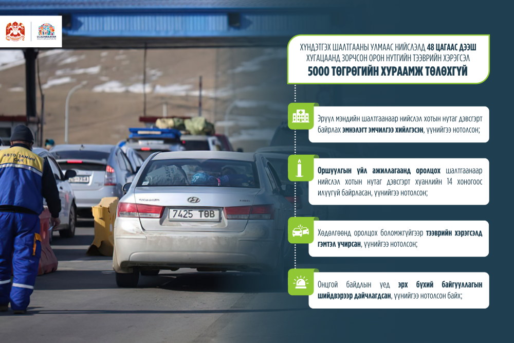| Хүндэтгэх шалтгаанаар нийслэлд 48 цагаас дээш хугацаанд зорчсон орон нутгийн тээврийн хэрэгсэл 5000 төгрөгийн хураамж төлөхгүй |
