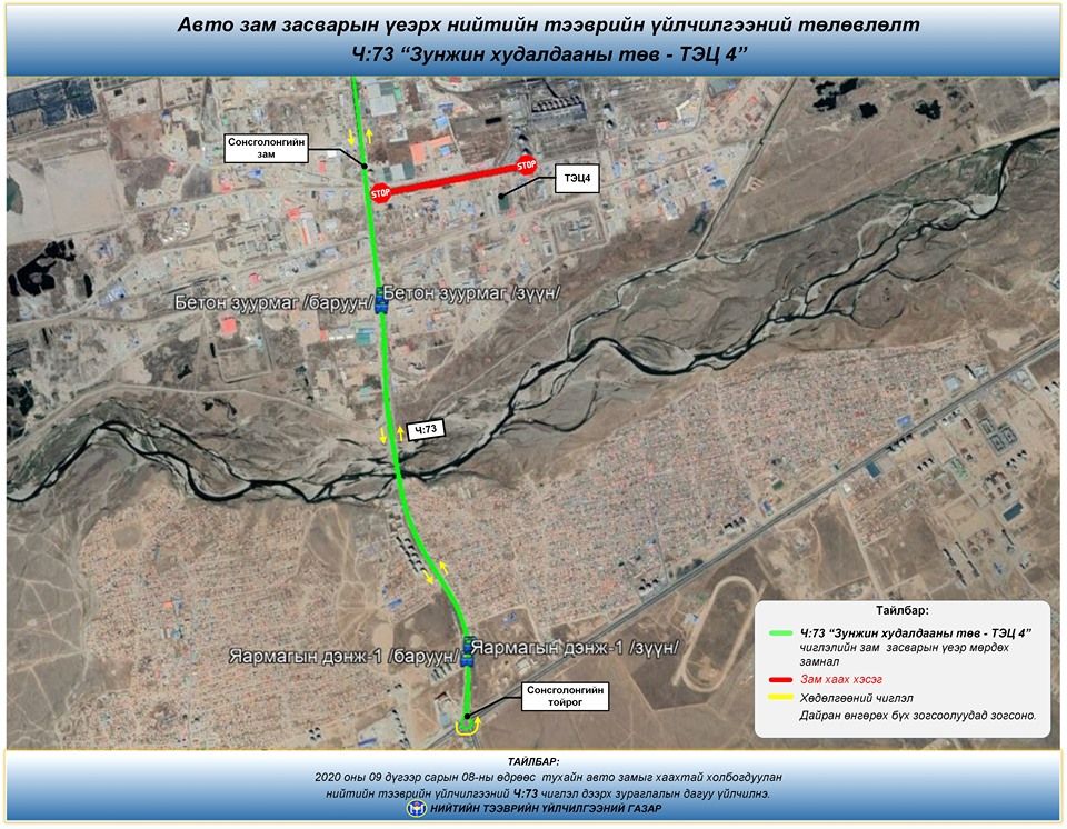 Баянгол дүүргийн 20 дугаар хороо, Эрчим хүчний гудамжаас Сонсголонгийн авто зам хүртэлх хөдөлгөөнийг хэсэгчлэн хааж, авто замын шинэчлэлт, засварын ажил хийгдэж байна. Иргэд та бүхэн 2020 оны 09 дүгээр сарын 08-ны өдрөөс эхлэн дараах зураглалын дагуу зорчилтоо төлөвлөнө үү..jpg)