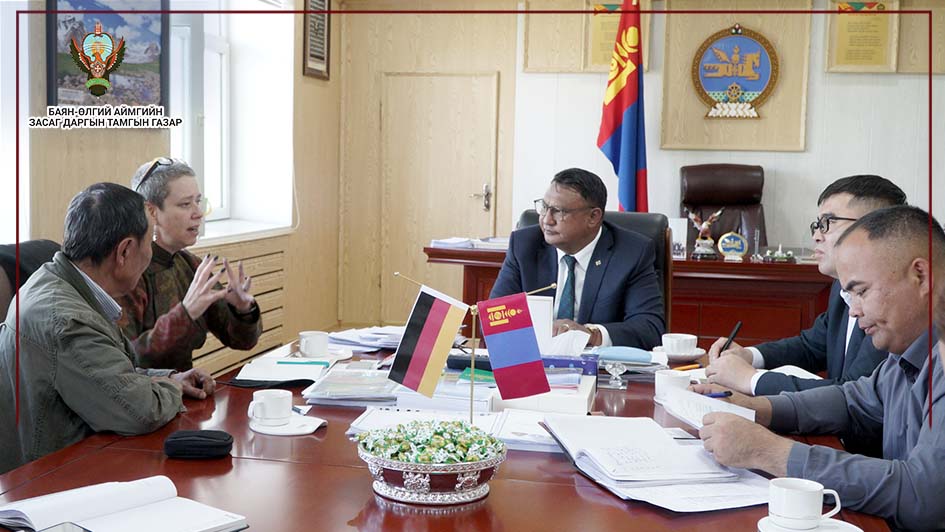 Баян- Өлгий аймгийн Засаг дарга Д. Бауыржан өчигдөр Германы олон улсын хамтын ажиллагааны нийгэмлэгийн хэрэгжүүлж буй “Эдийн засгийн өсөлт, бизнес эрхлэлтийг дэмжих” ”/Progress/ төслийн удирдагч Ютта Рейхаг тэргүүтэй хүмүүсийг хүлээн авч уулзжээ.