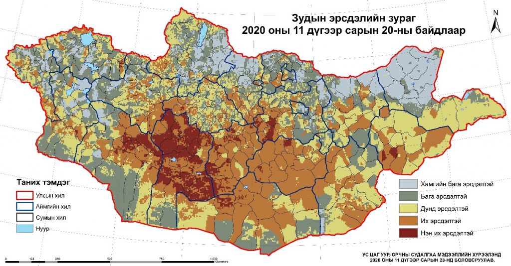Ус цаг уур, орчны судалгаа мэдээллийн хүрээлэнгээс ган зуншлага, цас зудтай холбоотой газрын ажиглалтын болон хиймэл дагуулын олон төрлийн мэдээг гаргадаг. Эдгээрийг нэгтгэн боловсруулж, зудын эрсдэлийн зурган мэдээг гаргасан байна.
