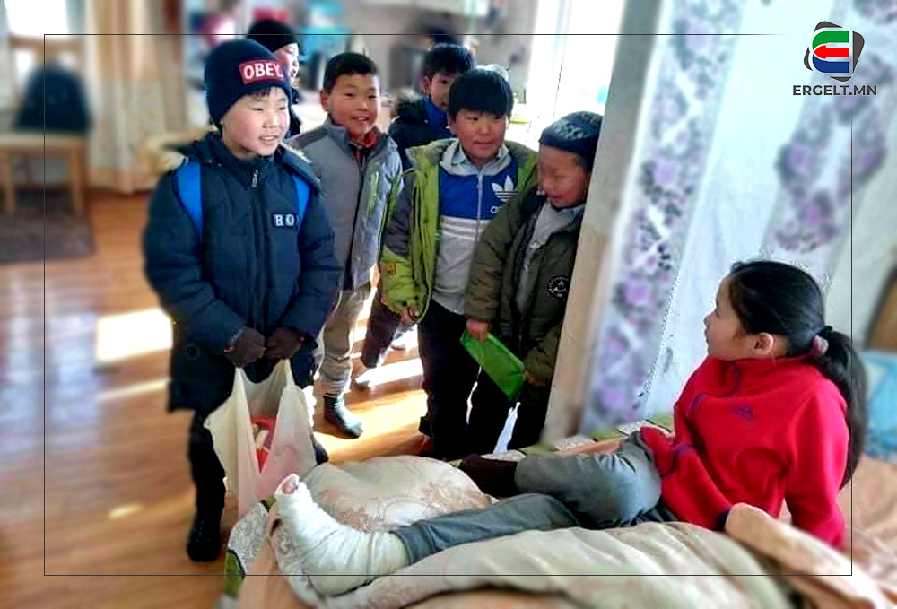 Хөл нь өвдөж, хүнд бэртсэн охиныг ангийнх нь хөвгүүд эргэж очиж байгаа зураг цахим орчинд тархаж, олон хүний хайр, хүндэтгэлийг хүлээгээд байна. Тэгвэл тус зурагны эзэд Дорнод аймгийн Баян-Уул сумын ерөнхий боловсролын сургуулийн тавдугаар ангийн сурагчид байжээ. Хүүхдүүд хөлөө хугалсан ангийнхаа охиныг эргэж, охины аав зургийг цахим орчинд тавьсан байна. Бид хамгийн тунгалаг харц, дулаахан инээмсгэлэл, хөөрхөн зургийн эзэн болох сурагч Б.Агь-Үжинтэй ярилцлаа. Тэрбээр хоёр жилийн өмнө хөлөө гэмтээсэн ч өдгөө эдгэж, эрүүл саруул ангийнхаа найзуудтай хөтөлцөөд гүйж яваа билээ.