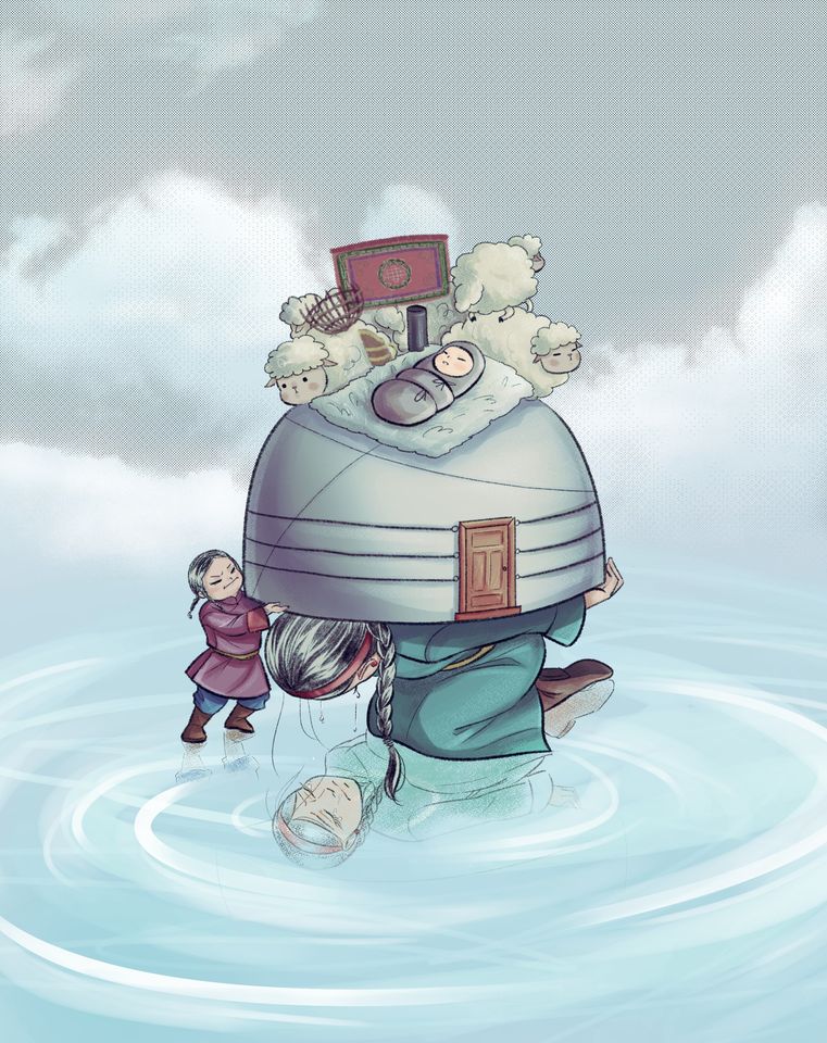 Коронавирусын үед өвлийн хүйтэнд эх хүү хоёрыг халат, углааштай нь гадаа гаргасан үйл явдал болсон шүү дээ. Тэрийг харчхаад би бүр байж сууж чаддаггүй ээ, сэтгэл өвддөг юм билээ. Гэхдээ энэ өвдөлтөө бусдад тараамааргүй санагдаад аль болох эерэг агуулгатай ээж хүүхэд хоёрт дэм болохыг хүсээд зураг зурсан.