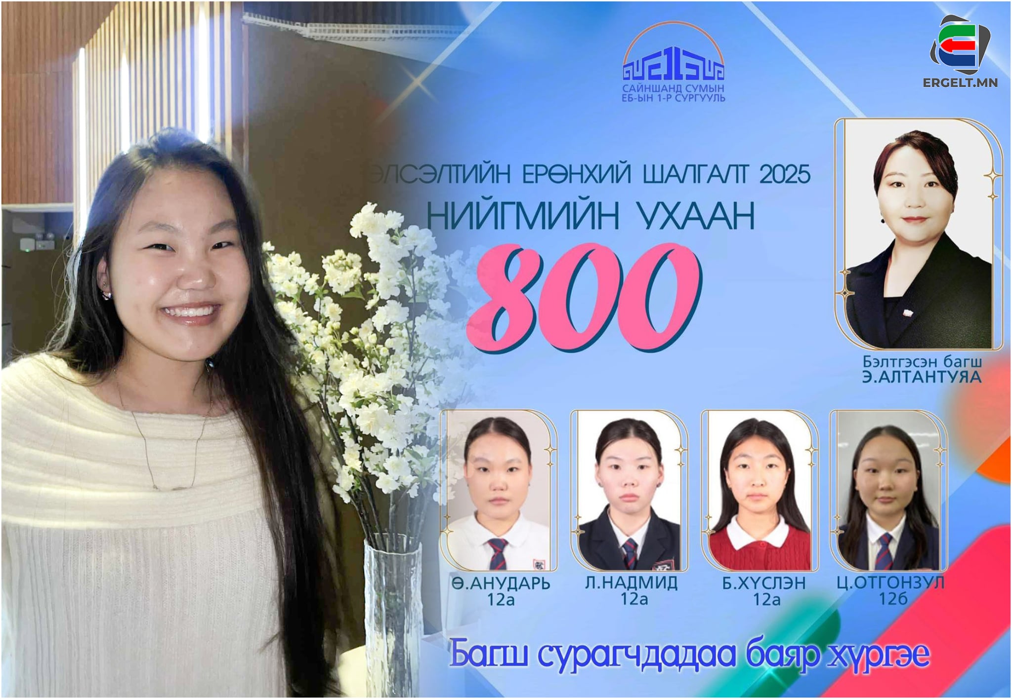 -Багш минь боловсролын салбарт 20 гаруй жил ажилласан. Энэ хугацаанд олон хүүхдийг ЭЕШ-д амжилтай бэлдсэн. Өнгөрсөн жил гурван шавь нь 800 оноо авсан, энэ жил дөрвөн шавь нь 800 оноо авлаа. Хүүхэд бүртэй тулж харьцаж, гаргадаг алдаа бүрийн анзаарч засаж өгдөг. Зорилгыг нь сайн тодорхойлж өгдөг, миний алдааг ч засаж өгсөн учраас би шалгалтаа амжилттай өгсөн байх.