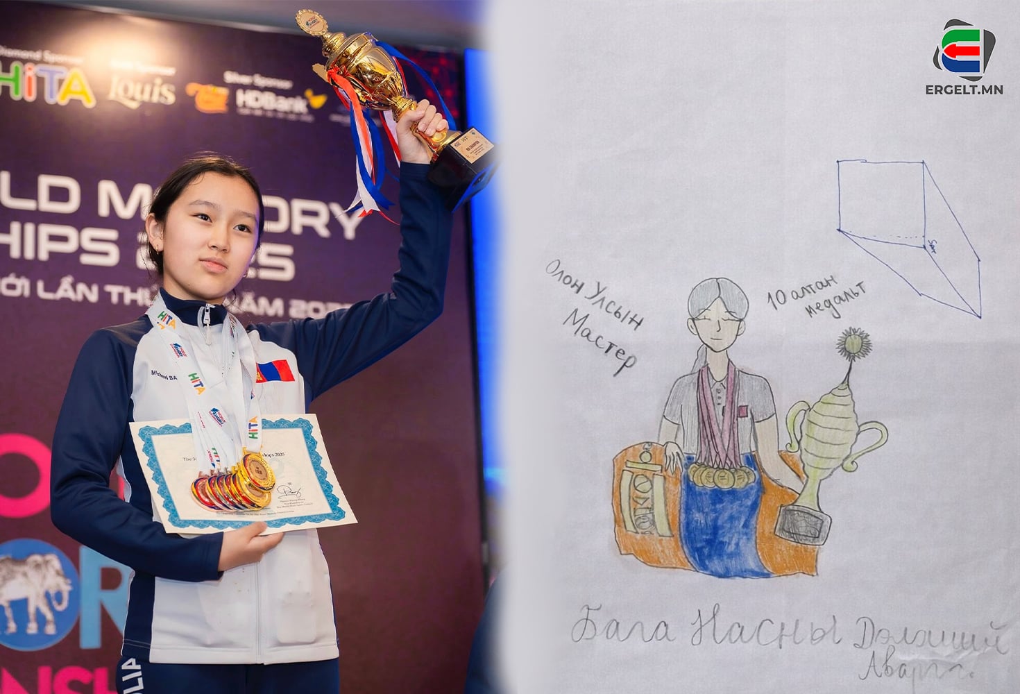 -Маш гоё бас их бахархалтай санагдсан. Монгол Улсын шигшээ багт Монголын оюун ухааны академийн хот, аймаг, дүүргийн 40 гаруй салбараас улсын болон олон улсын тэмцээнд амжилттай оролцсон шилдэг тамирчид шалгарч орсон. Бид 14 хоног тусгай бэлтгэл хийж Дэлхийн аваргад оролцсон. Манай Монголын баг долоодах удаагаа багаараа дэлхийн аварга болж, Монголын далбааг дэвжээн дээр мандуулсан. Хувийн амжилтаараа гурван алт, хоёр мөнгө, хоёр хүрэл медаль, хоёр дэлхийн рекорд тогтоож, Олон улсын мастер цол авч, бага насандаа Дэлхийн аварга болж чадсандаа маш их баяртай байна. Миний олон мөрөөдөл нэг өдөр зэрэг биелсэн өдөр байсан шүү. Гэхдээ энд зогсохгүй, цаашид илүү ихийг сурах, илүү их хичээх зорилготой байгаа.