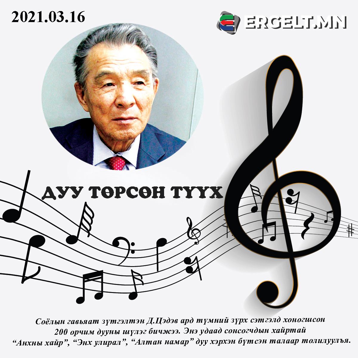 Соёлын гавьяат зүтгэлтэн Дожоогийн Цэдэв гуай 1940 онд Баянхонгор аймгийн Баян-Овоо суманд төржээ. Тэрбээр бага сургуулийн сурагч байхаасаа л шүлэг бичих дуртай байж. Түүнийг яруу найрагч, үргэлжилсэн үгийн гайхалтай зохиолч гэдгийг уншигчид андахгүй. Тэрбээр хүмүүсийн сайн мэдэхээр “Би чамд хайртай”, “Хөх ногооны униар”, “Шинэ хотын гэрэл” киноны дууны үгийг бичсэн авьяаслаг уран бүтээлч юм. Мөн үүнээс гадна 200 орчим зохиолын дууны үгийг бичсэн түүний соёл урлаг тэр дундаа нийтийн дууны ертөнцөд бүтээсэн гавьяа дуусашгүй. Түүний зохиосон “Энх улирал”, “Анхны хайр”, “Алтан намар” киноны дуу хэрхэн бүтсэн талаар “Дуу төрсөн түүх” буландаа онцлон хүргэе.