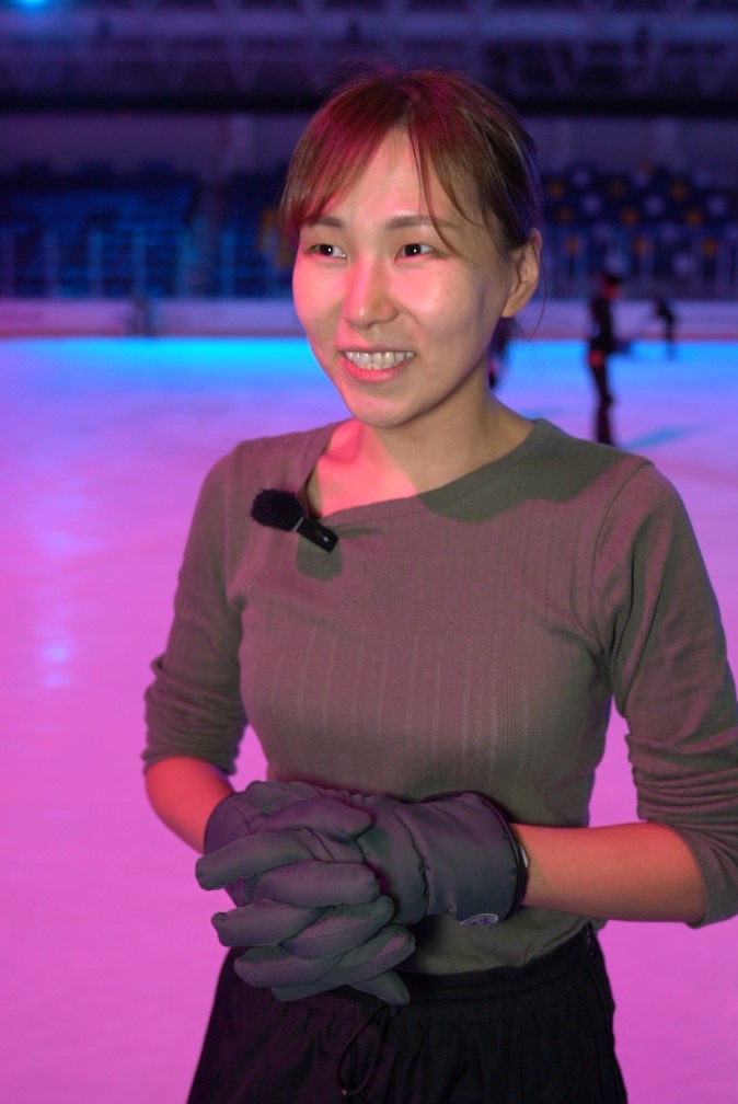Өдрийн дөрвөн цаг орчимд “Мөсөн өргөө”-д очиход тэрбээр 4-11 насны бяцхан гулгагчдад гулгалтын техник зааж байлаа. Түүний уян налархай, уран яруу хөдөлж, мөсөн дээр эргэлдэн бүжих хөдөлгөөн бүр нь уярам сайхан харагдана. Мөсөн дээр хүйтнийг үл ажран харц нь гэрэлтэн байх нь мэргэжилдээ дурласныг илтгэнэ.