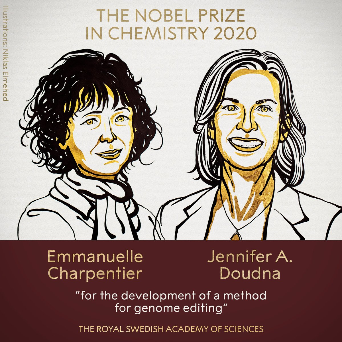 2020 оны химийн салбарын Нобелийн шагналыг Эммануэль Чарпентье, Женнифер Дудна нарт “амьд организмын удамшлын мэдээллийг генийн төвшинд өөрчилж, засах аргыг хөгжүүлсэн учир” олголоо.