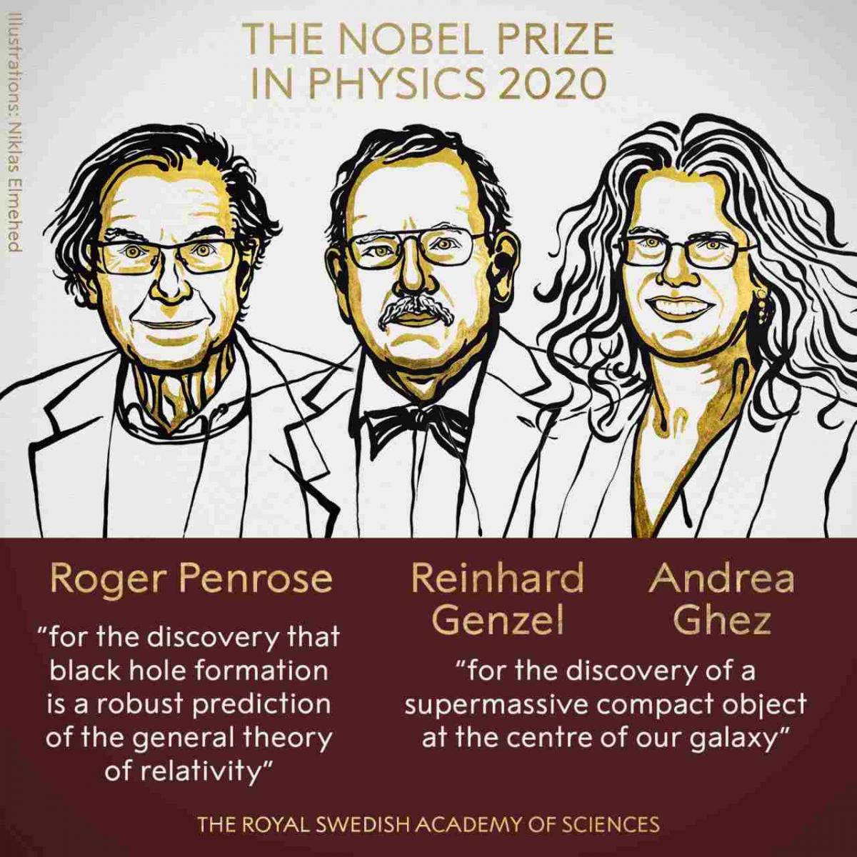 Английн физикч Рожер Пенроуз, Германы одон орны физикч Райнхард Генцель, Америкийн одон орон судлаач Андреа Гез нар энэ оны физикийн салбарын Нобелийн шагналтнуудаар тодорлоо.