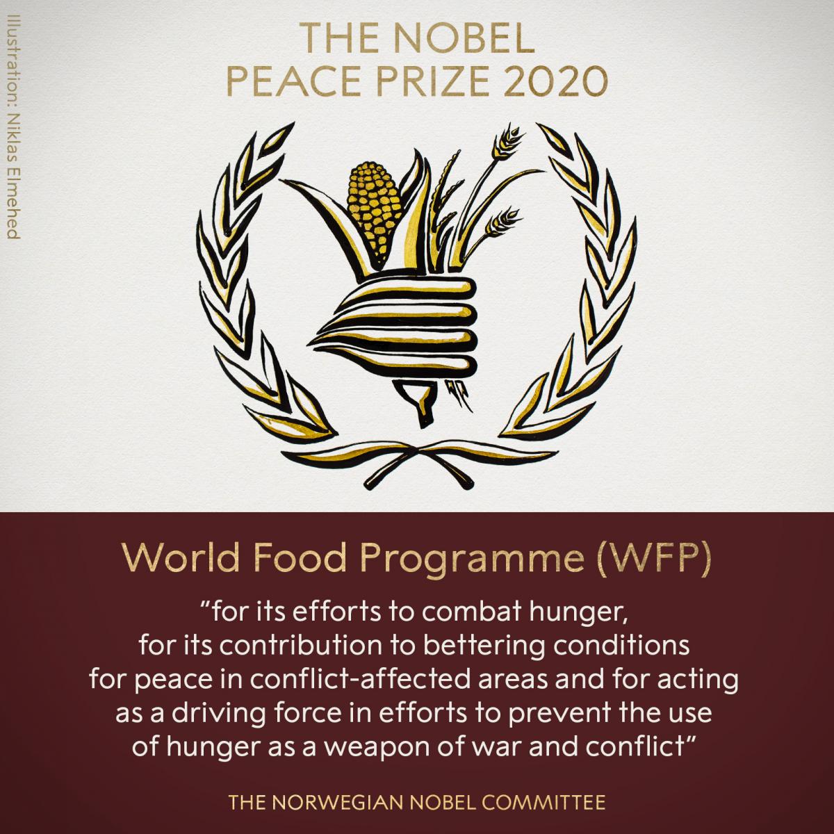 "Өлсгөлөнтэй тэмцэхэд гаргасан хүчин чармайлт, мөргөлдөөний бүсүүдэд энх тайван тогтооход оруулсан хувь нэмэр болон өлсгөлөнг дайн, мөргөлдөөний зэвсэг болгон ашиглахаас урьдчилан сэргийлэх үйлсэд тэргүүлэх үүрэг гүйцэтгэснийх төлөө" Нобелийн Энх тайвны шагналыг Дэлхийн хүнсний хөтөлбөрт олгожээ. Өлсгөлөнд нэрвэгдэж, өлсгөлөнгийн аюул нүүрлэж буй олон сая хүнд дэлхий нийт анхаарал хандуулаасай хэмээн уг шагналыг гардуулжээ.