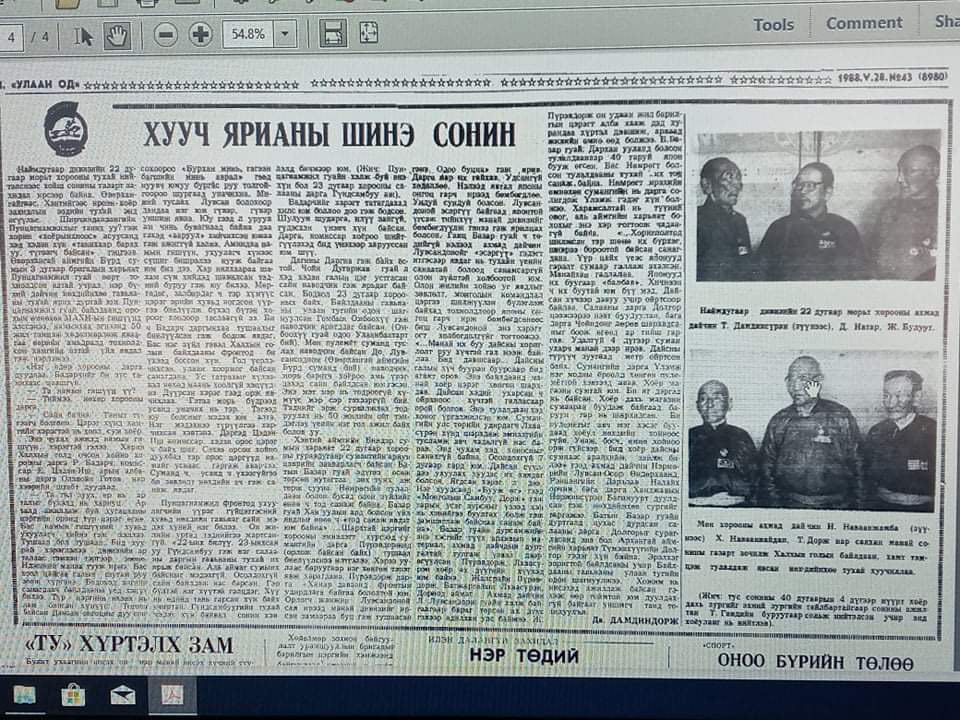 Харин өөр нэгэн захидалд “Ахмад үеийнхний халуун мөрөн дээр гишгэж эх орноо хамгаалах ариун үйлсэд хувь нэмрээ хандивлаж яваа энэ залуугийн бодол эрэгцүүлэл бас сонин юм. Миний бодход энд зөвхөн удирдлагын хэдхэн хүний тухай бус, бүхэл бүтэн хорооны тухай яригдаж байх шиг санагдана. Эх орныхоо төлөө халуун амь, бүлээн цусаа үл хайрлан тулалдаад эцсийн эцэст нэр төр, ёс суртахуунаар хохирно гэж юу гэсэн үг вэ. Магтуулах гэж гавьяа байгуулдаггүй ч мартагдахыг хэн ч хүсэхгүй. Тэр тусмаа энх амьдрал, эх орныг минь бүрэн бүтнээр нь бидний алган дээр тавьсан ахмад үеийнхнийхээ ач буяныг залуус бид мартаж болно гэж үү. Эх орны төлөө тулалдагсдын алдрыг мөнхлөн ариун санаанд нийцүүлэн наймдугаар дивизийн 22 дугаар морьт хорооныхонтой сонины хуудсанд уулзмаар байна. Миний мэдэхээс домогт пулемётчин байлдагч Дуламдоржийн Самданд (22 дугаар хорооны IV сумангийнх) БНМАУ-ын баатар цолоор нэхэн шагнасан, цаана нь хичнээн ийм баатарлаг үйлстэн, эх оронч гавьяа түүхийн тэртээд “нуугдан” үлдсэнийг мэдэх юм алга” гэж бичсэн байна.
