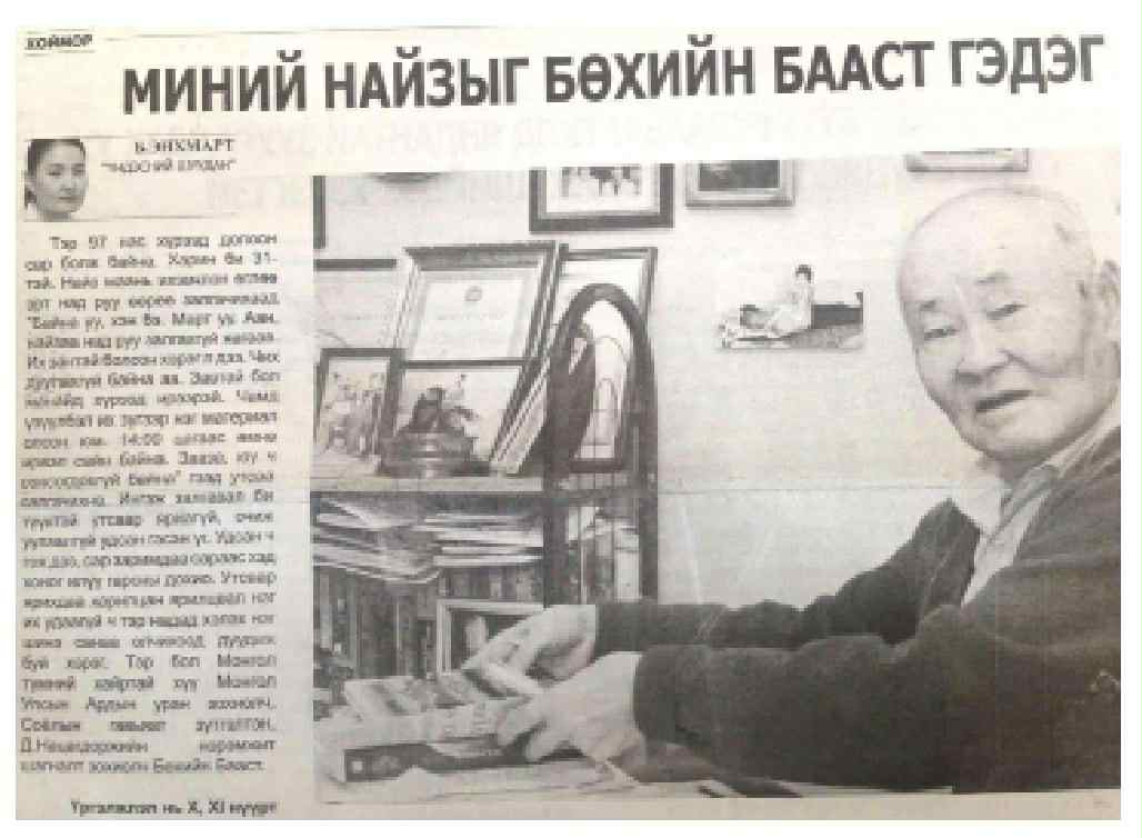 Миний “найз” Бөхийн Бааст гуай нэг удаа “Энэ өндөр насыг насална гэдэг хүсэх юм биш шүү дээ, Март минь. Энэ бол туулж өнгөрүүлсэн амьдрал, түшиж тулж явсан нөхдийнхөө үнэн түүхийг өнгө будаггүйгээр бичиж үлдээх хүнд даалгавар, өр. Бараг зуун жил амьдарсан надад бичиж, тунхаглаж, түүхэнд биш юмаа гэхэд номондоо үлдээх хэчнээн олон хүн байна гэж санана. Үр хүүхдүүдэд нь, уншигч олонд тэр сайхан хүмүүсийн үүх түүх, сайн сайхан зан чанар, амьдралын төлөөний зүтгэл, үлгэр дуурайлал нь үлдэх ёстой юм. Зохиолч, юм бичдэг хүн бүхний нэг чухал үүрэг, хийхгүй “явж” ер болохгүй ажил нь бусдынхаа түүхийг бичиж үлдээх гэж би санадаг. Тийм ч учраас ах нь найзалж, нөхөрлөж явсан хүмүүсийнхээ тухай цөөнгүй дурсамж бичсэн ч ахиад нэлээд хүн “Намайг бичих нь үү, энэ Бааст” гээд дээрээс хараад байж байна аа” гээд инээвхийлж билээ. Очих бүрд “Сэтгүүлч хүн чанартай, сайн кофе уух ёстой. Чамд би нэг дориун сайхан найруулаад өгье” гээд л сэнжтэй аяганд хийсэн кофегоо тачигнуулан хутгадаг сан.
