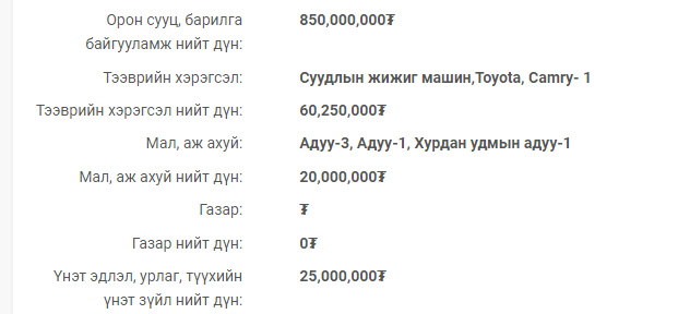 Орон сууц, барилга байгууламж нийт дүн: 850.000.000 төгрөг